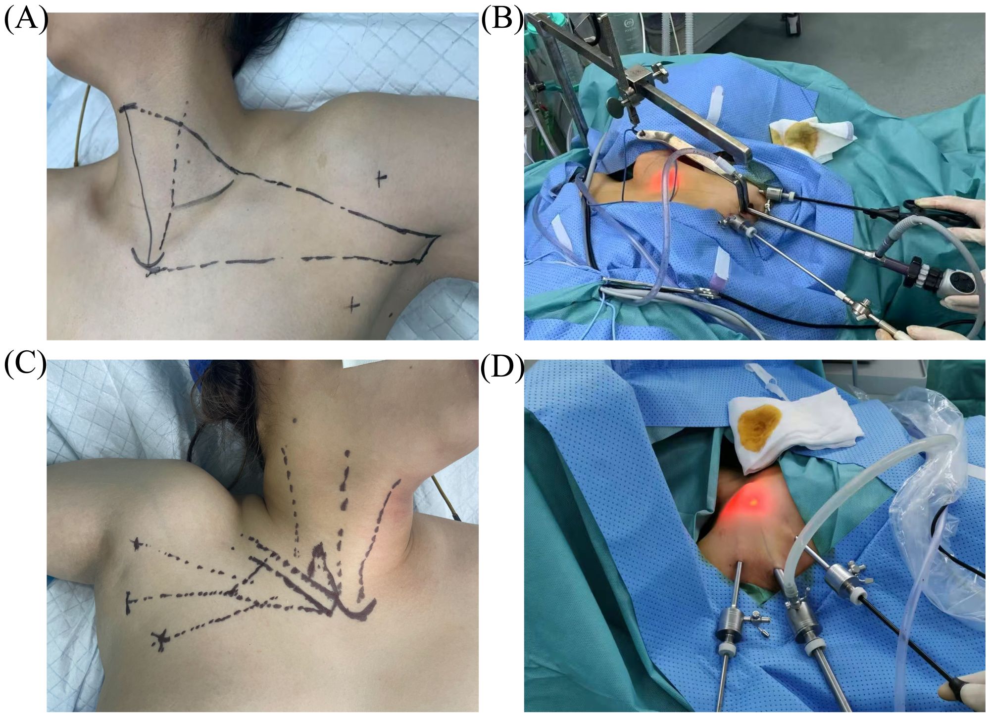 A series of four images depicting a surgical procedure. (A) Shows a patient's neck and shoulder with surgical markings. (B) Displays the patient in an operating room with surgical instruments inserted and a blue drape. (C) Similar to (A), with additional markings around the neck. (D) Zoomed view of the operation area with instruments and a red light indicating activity.