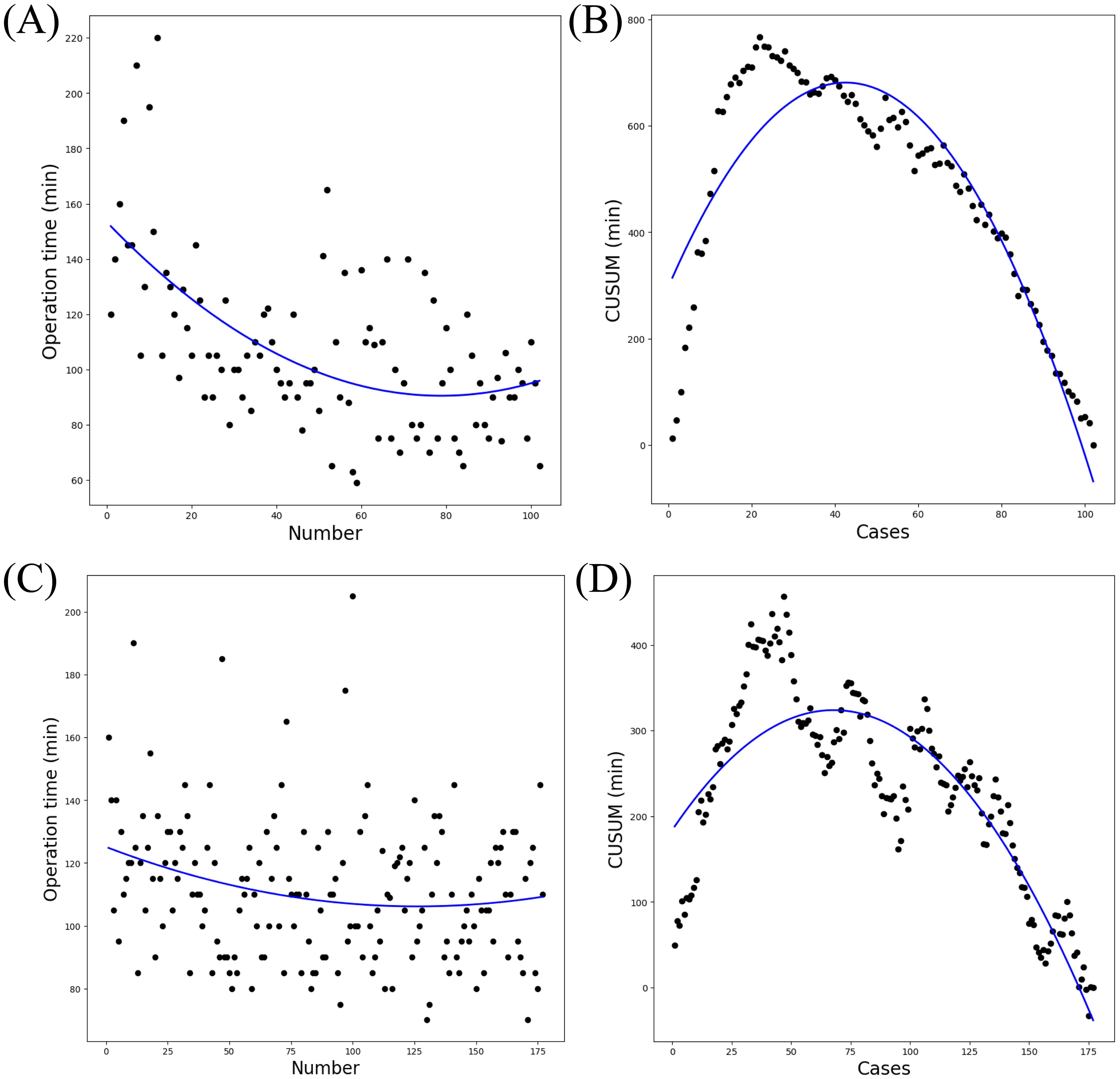 Scatter plots in four panels (A, B, C, D) depict trends in surgical data. Panel A shows operation time versus number, decreasing with increased cases. Panel B shows CUSUM versus cases, peaking around case 42. Panel C again shows operation time versus number, with a flatter trend. Panel D illustrates CUSUM versus cases peaking around case 67. Blue trend lines indicate general data patterns.