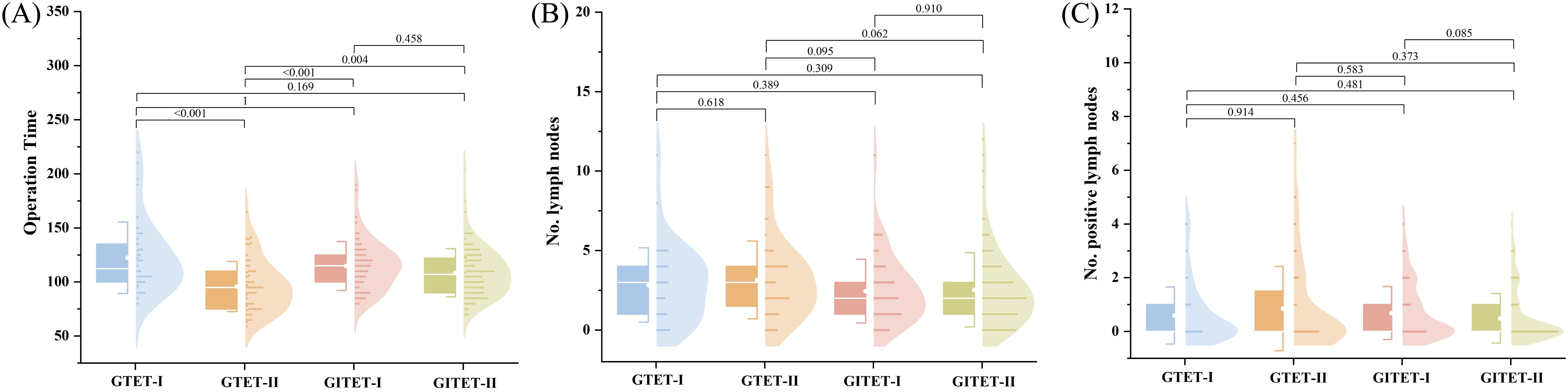 Violin plots comparing four groups (GTET-I, GTET-II, GITET-I, GITET-II) on three metrics: (A) Operation Time, (B) Number of Lymph Nodes, and (C) Number of Positive Lymph Nodes. Statistical significance is indicated between pairwise comparisons, with various p-values shown above the plots. Each plot displays distribution and median values for each group.