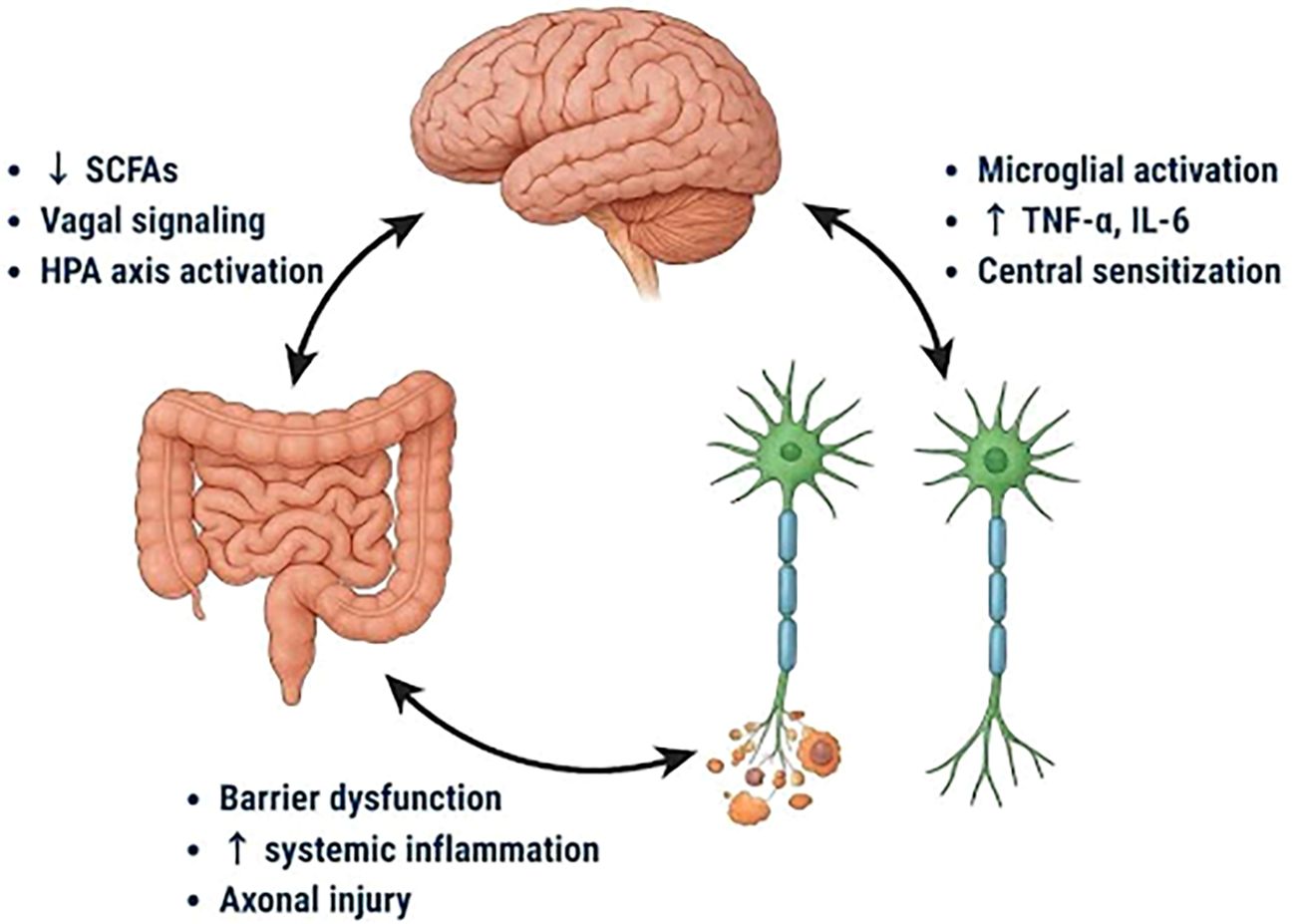 Microbial metabolites, particularly short-chain fatty acids (SCFAs), are required for maintaining epithelial and neuronal homeostasis, but reduced SCFA availability correlates with the severity of neuropathic pain (22, 25, 26). Preclinical studies show that dysbiosis modulates vagal signaling, hypothalamic-pituitary-adrenal activity, and microglial activation, which together enhance neuroinflammation (27–29).