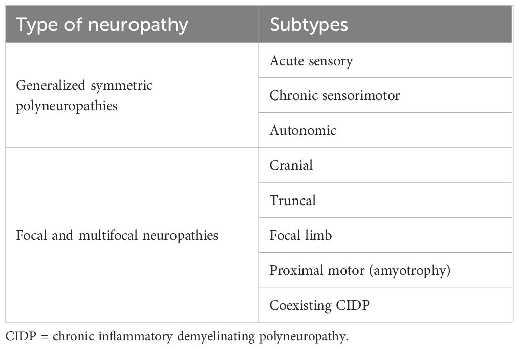Diabetic neuropathy (DN) is among the most frequent complications of both types 1 and 2 diabetes mellitus (T1DM and T2DM), affecting up to 50% of diabetic patients (1). The current prevalence of diabetes is estimated to be 537 million adults across all age groups and continents. Moreover, the number has been increasing and is projected to rise to 783 million by 2045, even more terrifying that by 2050 this number could reach up to 1.31 billion (2). Reported prevalence of diabetic neuropathy differs among various age groups, cultural and geographical factors, diverse diagnostic tools, and considering glucose state peculiarities. For instance, the MONICA/KORA study has shown that the overall prevalence of neuropathic pain was 13.3% among people with diabetes, 8.7% with glucose intolerance, 4.2% in those with impaired fasting glucose level, and only 1.2% of normoglycemic individuals (3). Additionally, different diagnostic tools yield relatively diverge ranges, estimating at 11-13% of DN among individuals with T1DM diagnosed with the Michigan Neuropathy Screening Instrument (MNSIQ) (4, 5), in opposite to 28% when diagnosed clinically measuring vibration perception thresholds (6, 7). Several classifications of the diverse syndromes affecting the peripheral nervous system in diabetes have been proposed in recent years. Here, we presented the adapted classification from originally described by Thomas (Table 1) (8).