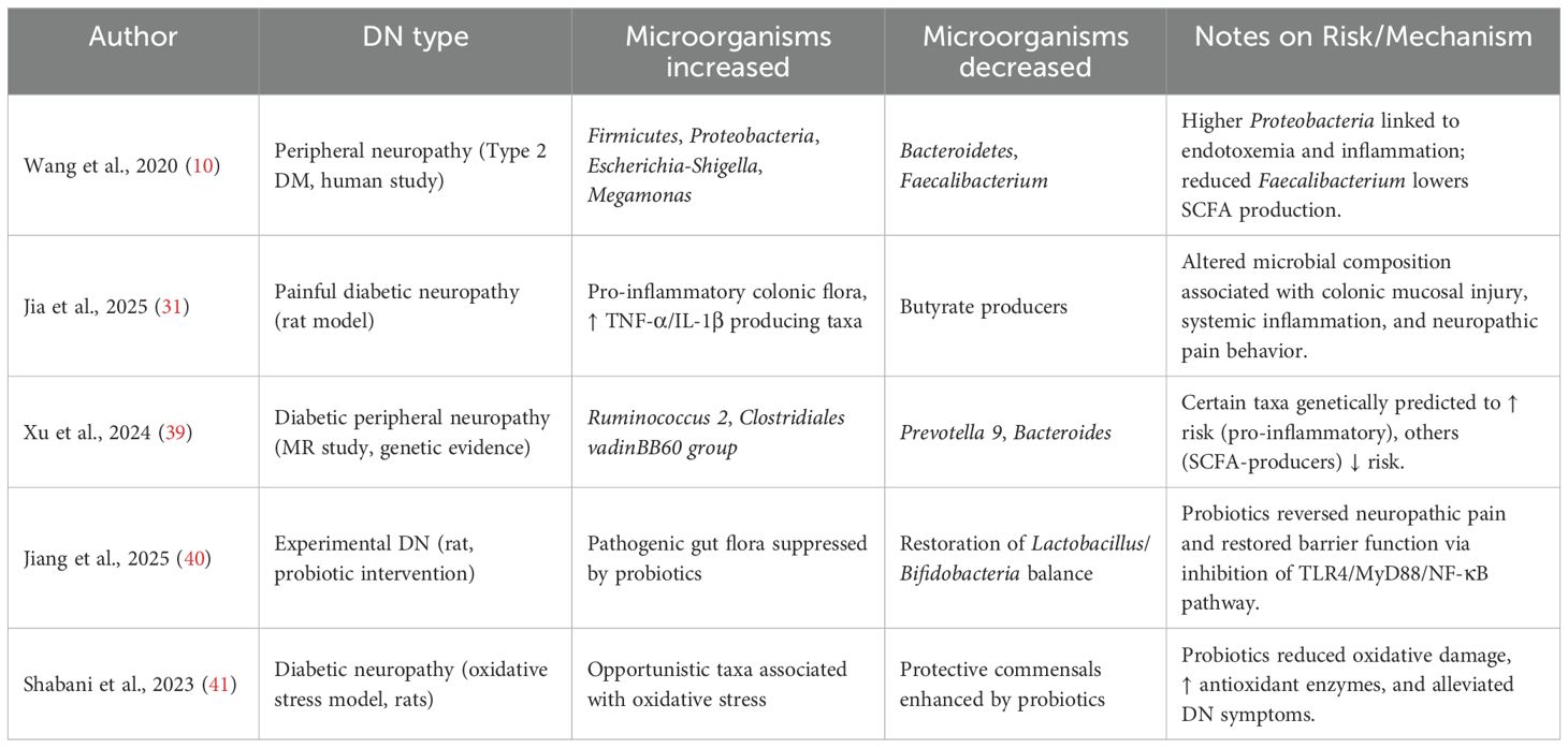 To illustrate these associations, Table 2 summarizes key microbial alterations recently identified across different types of DN and experimental models, highlighting microbial link to greater or fewer risk of disease development.