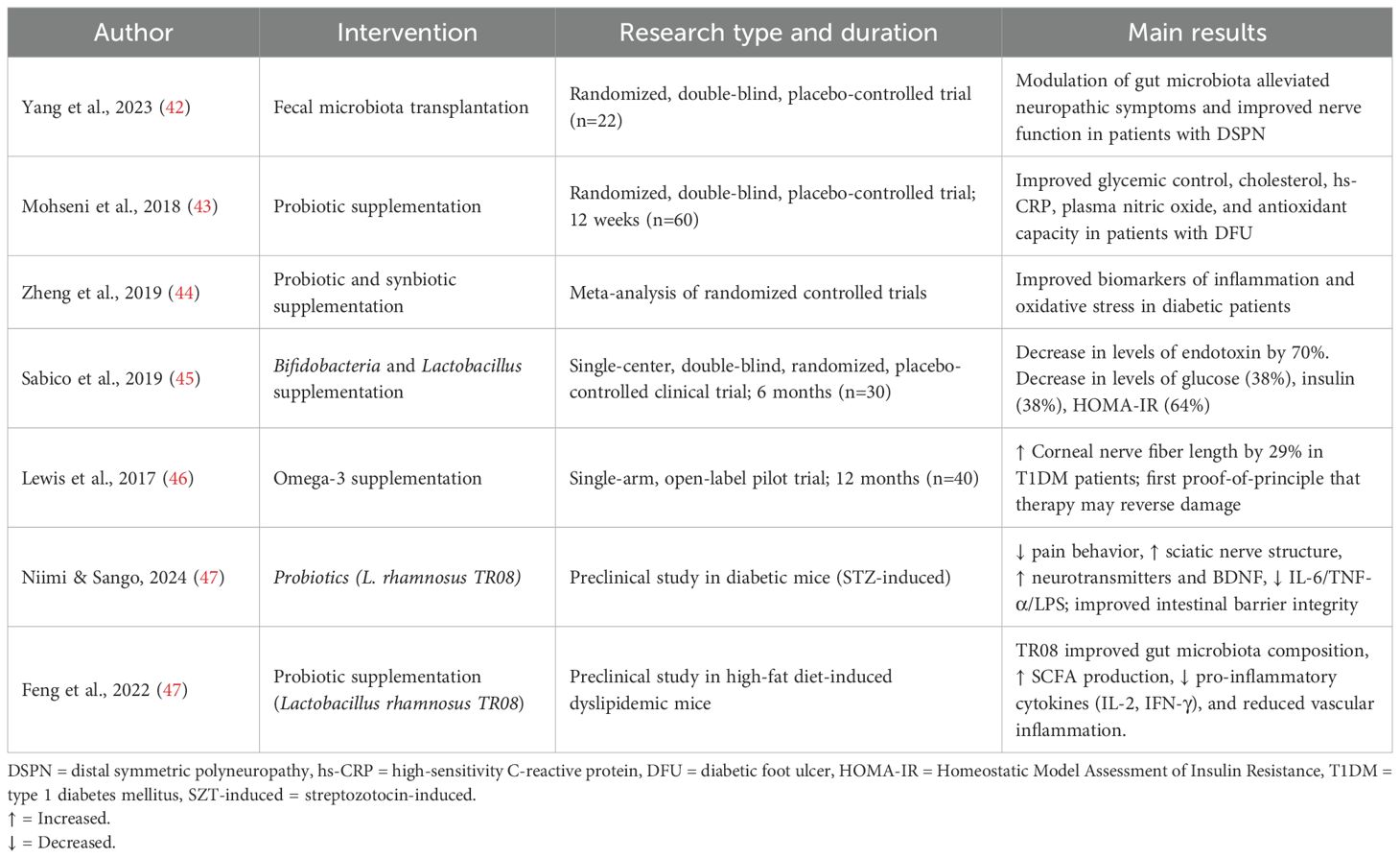 As of August 2025, several promising approaches have been represented, one of which is fecal microbiota transplant (FMT) (Table 3). A randomized, double-blind, and placebo-controlled trial demonstrated that through modulation of the composition and function of gut microbiota via FMT, neuropathic symptoms can be alleviated, and moreover, nerve function can be improved in patients with distal symmetric polyneuropathy (DSPN) (42). Another emerging potent therapeutic player has been considered in probiotic supplementation. In the randomized, double-blind, placebo-controlled trials has been shown probiotic supplementation for 12 weeks among patients with diabetic foot ulcer had a beneficial effect on glycemic control, total cholesterol, high-sensitivity C-reactive protein, plasma nitric oxide, and total antioxidant capacity (43). Similar conclusions have been drawn from meta-analysis of randomized controlled trials, suggesting that probiotic and synbiotic supplementation may help to improve biomarkers of inflammation and oxidative stress in diabetic patients (44).