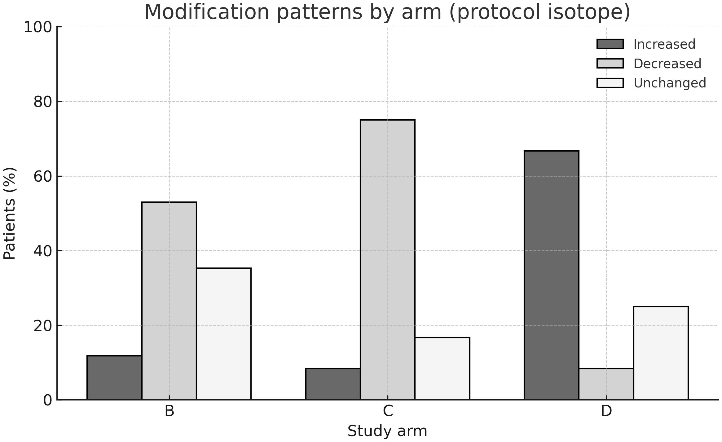 Figure 1. Modification patterns by study arm. Bar chart showing the proportion of patients with increased, decreased, or unchanged isotope activities in arms (B-D). By protocol, [90Y] was modulated in arm (B) and [177Lu] in arms (C, D), while the complementary isotope was kept constant. The majority of patients in arms (B, C) experienced activity reductions, whereas dose increases predominated in arm (D).