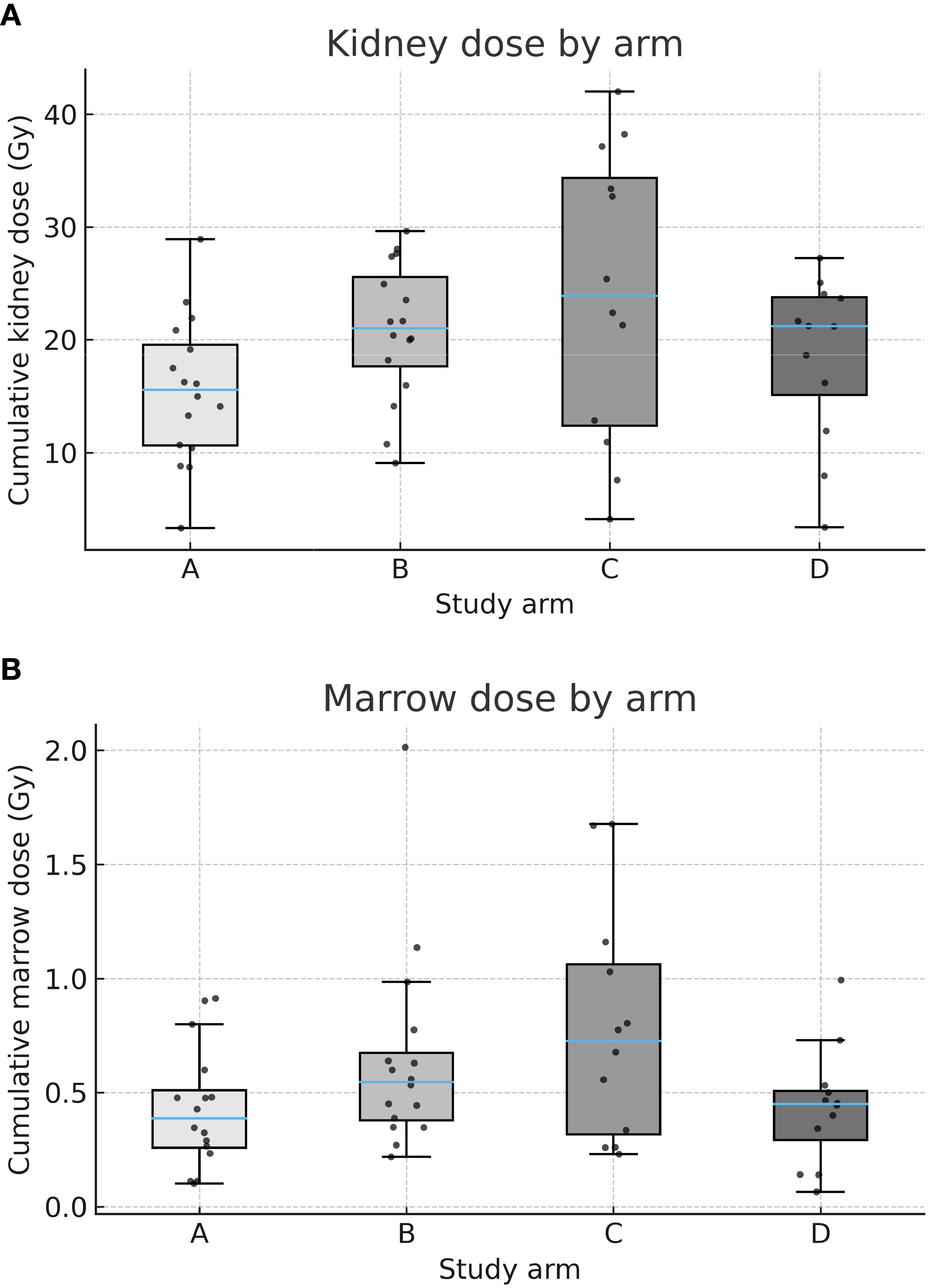 Figure 2. (A) Cumulative kidney dose by arm. Box-and-whisker plots (with jittered individual values) showing cumulative absorbed kidney doses (Gy) across arms A–D. Median kidney dose was lowest in arm A (fixed-activity [177Lu]) and highest in arm C (dosimetry-guided [177Lu] + fixed-activity [90Y]). (B) Cumulative marrow dose by arm. Box-and-whisker plots (with jittered individual values) showing cumulative absorbed marrow doses (Gy) across arms A–D. Median marrow dose was lowest in arm A and highest in arm C.