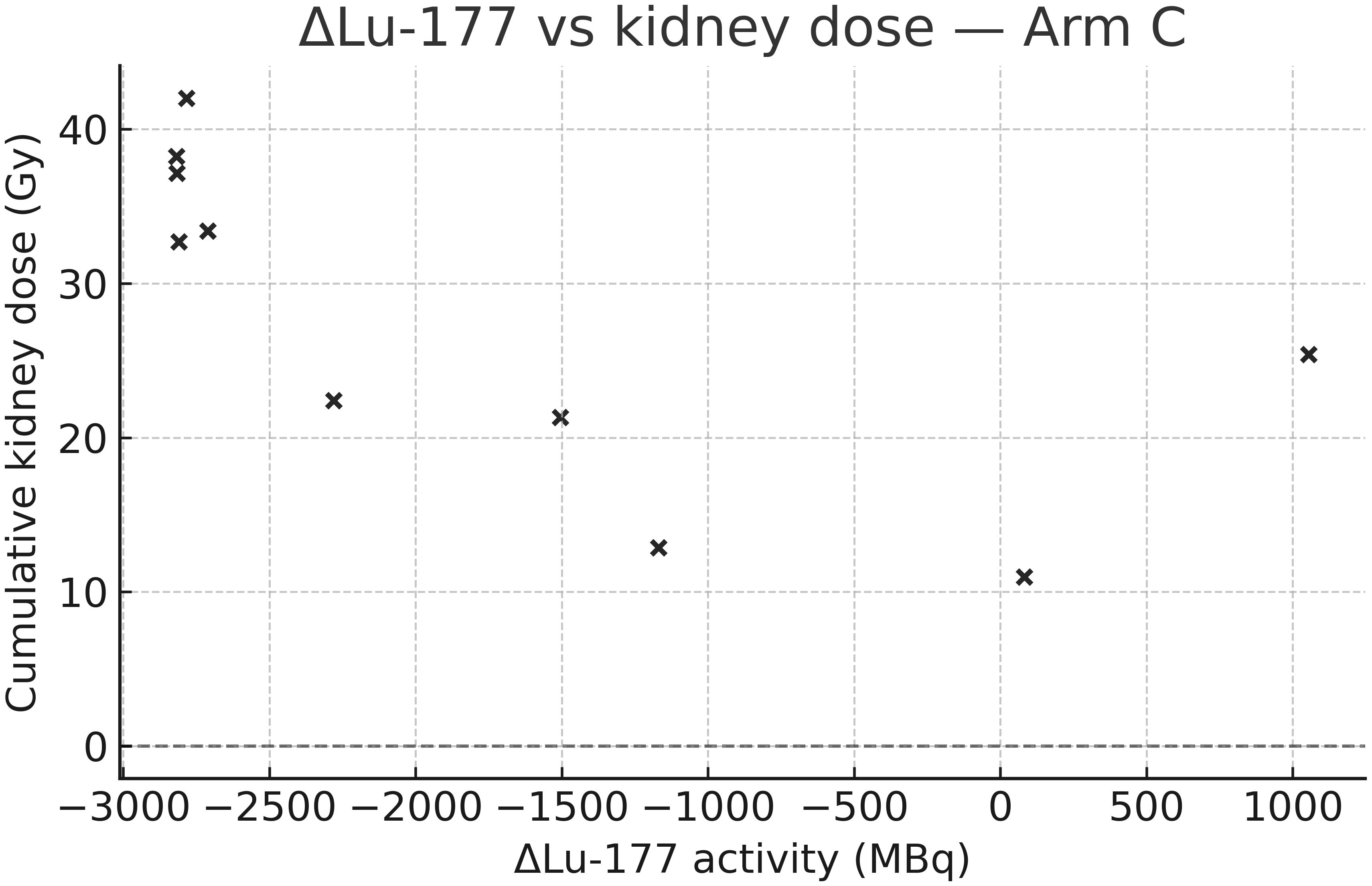 Figure 3. Correlation between Δ[177Lu] activity and kidney dose in arm C. Scatter plot showing the relationship between mean change in administered [177Lu] activity (post-baseline vs. baseline) and cumulative kidney dose (Gy) in arm C. A significant negative correlation was observed, indicating the predominant role of [90Y] in determining kidney exposure.