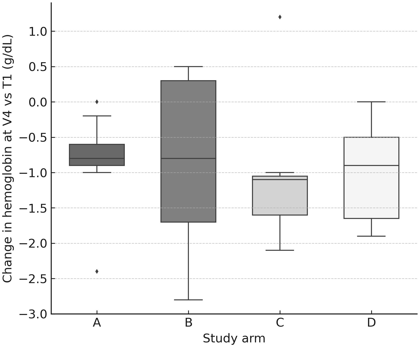 Figure 4. Hemoglobin change at V4 by arm. Box-and-whisker plots (with jittered individual values) showing change in hemoglobin concentration (g/dL) at V4 relative to baseline (T1). A modest but consistent decline was observed across all arms.