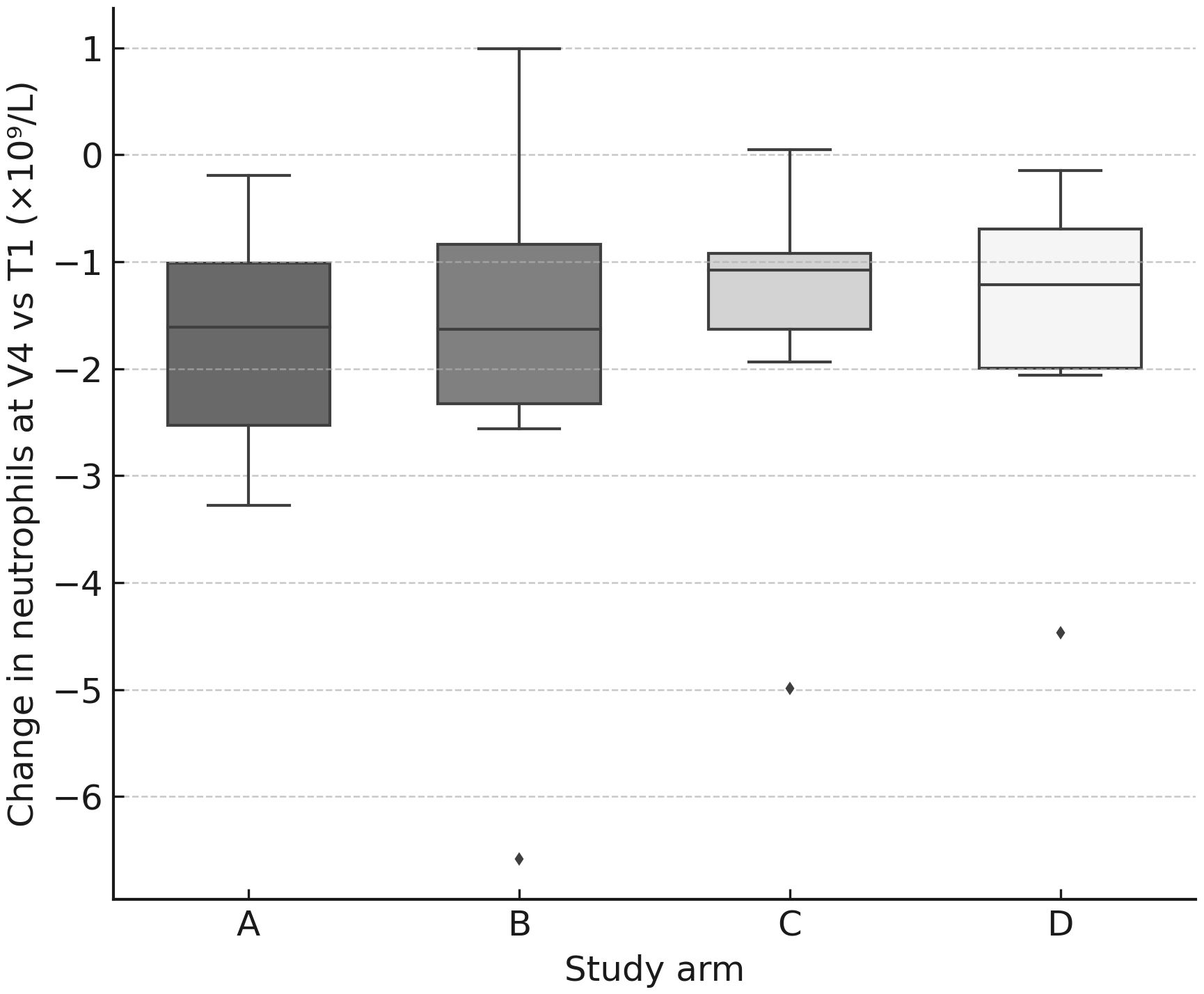 Figure 5. Neutrophil change at V4 by arm. Box-and-whisker plots (with jittered individual values) showing change in neutrophil count (×109/L) at V4 relative to baseline (T1). Declines were observed in all arms, consistent with transient hematologic toxicity.