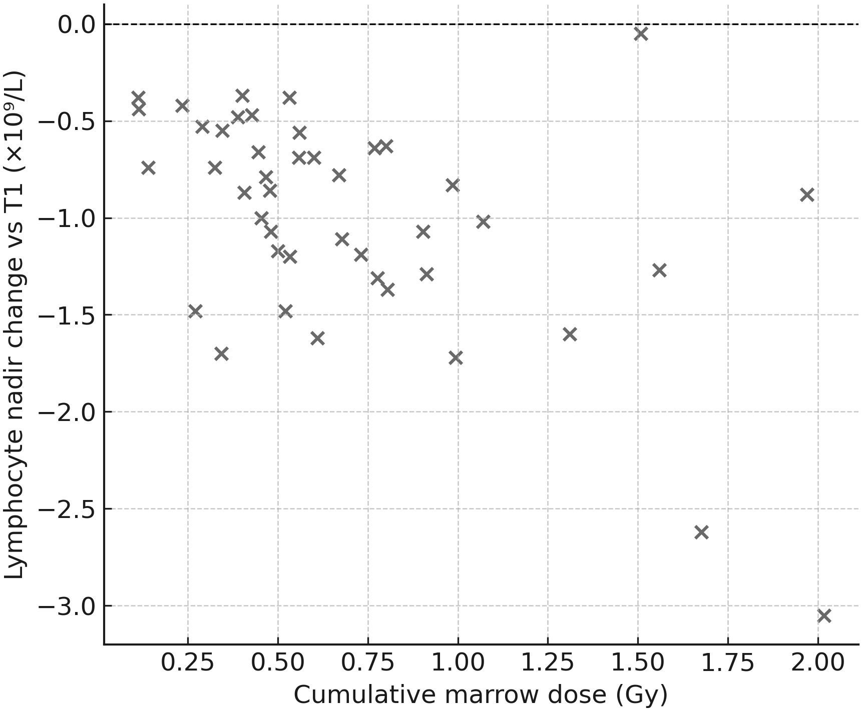 Figure 6. Lymphocyte nadir vs. cumulative marrow dose. Scatter plot showing the correlation between nadir lymphocyte count (Δ vs. T1) and cumulative marrow dose (Gy). A moderate negative correlation was identified (Spearman ρ≈−0.49), indicating that greater marrow exposure was associated with deeper lymphocyte declines.