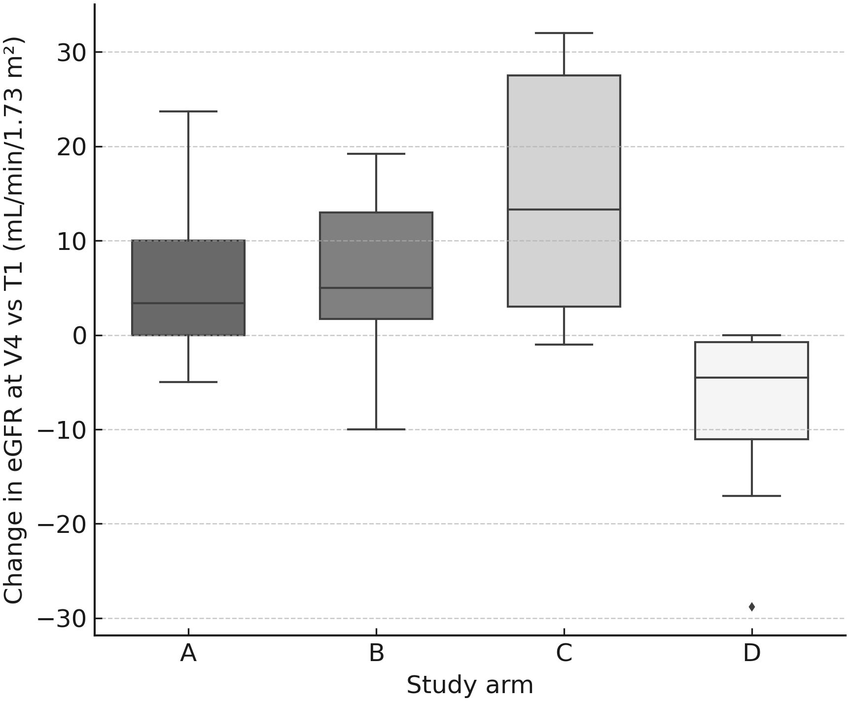 Figure 7. eGFR change at V4 by arm. Box-and-whisker plots (with jittered individual values) showing change in estimated glomerular filtration rate (mL/min/1.73 m²) at V4 relative to baseline (T1). No clinically significant differences were observed between arms.