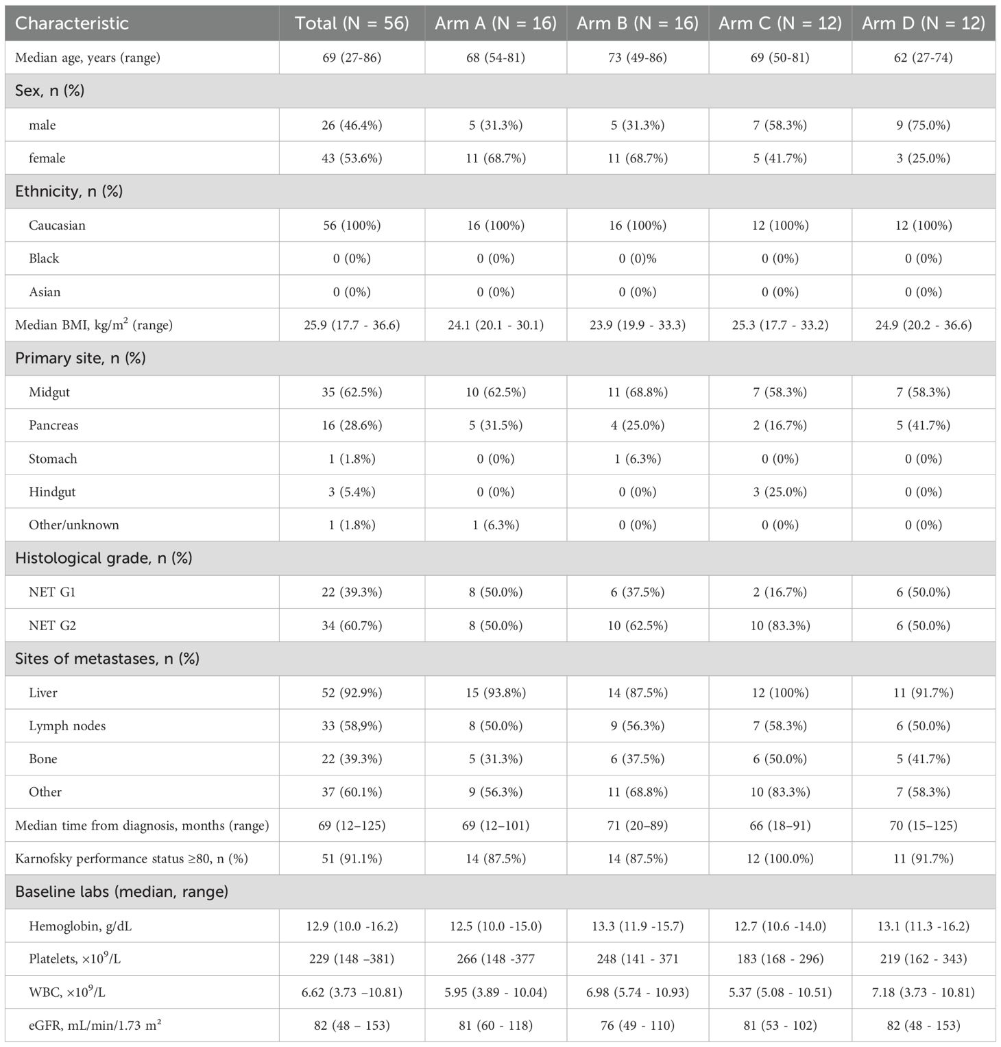 A total of 56 DUONEN trial patients (Table 1) were included in the interim analysis, with 16 assigned to arm A (standard RLT with [177Lu]Lu-DOTA-TATE), 16 to arm B, 12 to arm C, and 12 to arm D (dosimetry-modified arms). The median age at enrollment was 69 years (range: 27–86), and 46.4% of patients were male. The majority of patients presented with gastroenteropancreatic NETs originating from the midgut (62.5%) and pancreas (28.6%), with smaller proportions from the hindgut, stomach, or other primary sites. Most tumors were well-differentiated G2 GEP-NETs (60.7%), followed by G1 (39.3%). At the baseline, all patients demonstrated somatostatin receptor–positive disease on imaging.