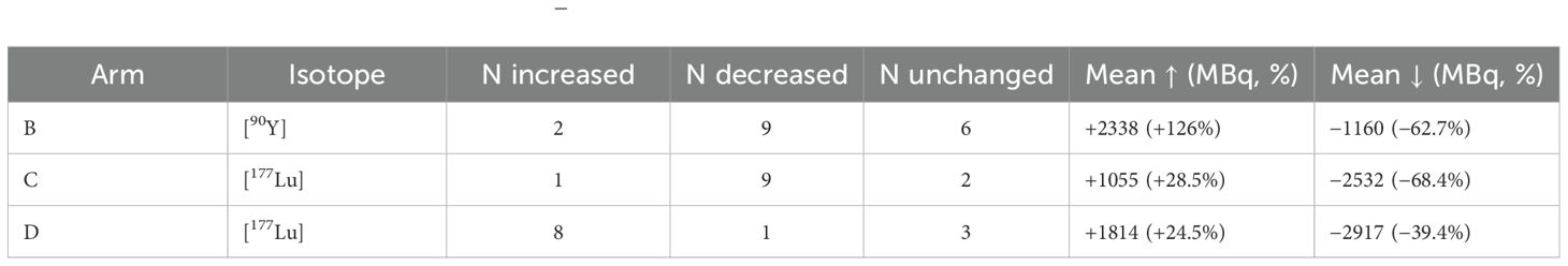 The magnitude of changes varied: average reductions amounted to −1160 MBq (−62.7%) for 90Y in arm B and −2532 MBq (−68.4%) for 177Lu in arm C, while increases averaged +2338 MBq (+126%) and +1055 MBq (+28.5%), respectively. In arm D, 177Lu activity was increased on average by +1814 MBq (+24.5%) and decreased by −2917 MBq (−39.4%).