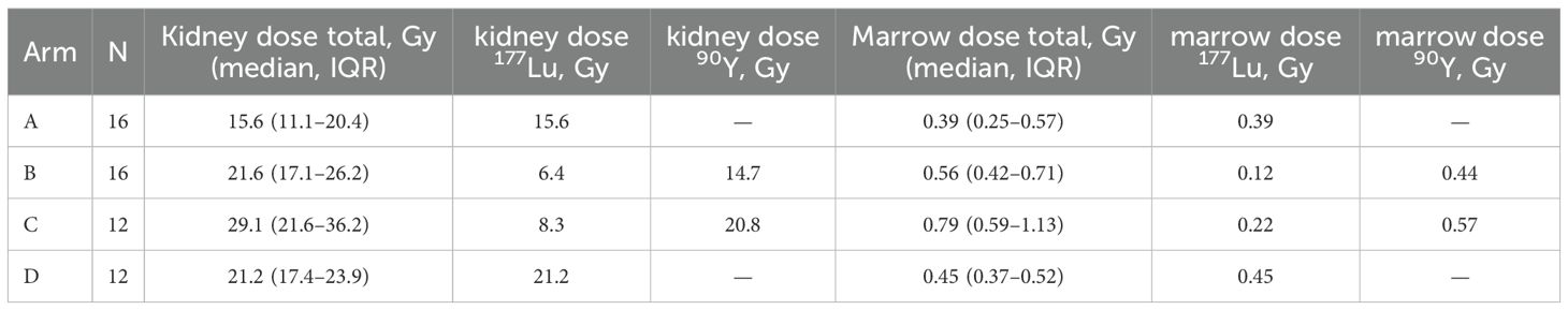 Median cumulative kidney and marrow doses are presented in Table 3. Patients in the control arm A (fixed-activity 177Lu, 4×7.4 GBq) received the lowest doses to both kidneys (15.6 Gy, IQR 11.1–20.4) and marrow (0.39 Gy, IQR 0.25–0.57).