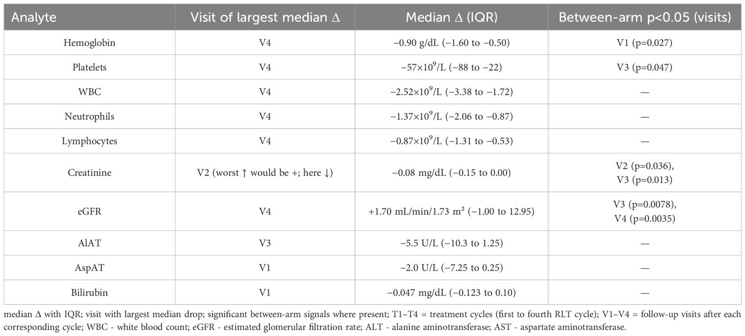 Renal biochemistry remained stable overall. The worst median Δ creatinine occurred at V2 and was negative (−0.08 mg/dL; IQR −0.15–0.00), and eGFR medians tended to be stable to slightly improved by V4 (+1.70 mL/min/1.73 m²; IQR −1.00–12.95). Paired tests showed V3→V4 changes for creatinine (p=0.011) and eGFR (p=0.001), consistent with mild late shifts but without clinical deterioration. Between-arm tests detected differences at selected visits (creatinine V2 p=0.036, V3 p=0.013; eGFR V3 p=0.0078, V4 p=0.0035), yet changes in creatinine/eGFR did not correlate with cumulative kidney dose (no significant Spearman correlations), and activity-modification categories (↑/↓/=) in B/C/D did not significantly affect renal “worst Δ” in within-arm analyses. Importantly, arm D (escalated 177Lu) showed no signal of worsened creatinine/eGFR vs other arms at V4 (Figure 7).