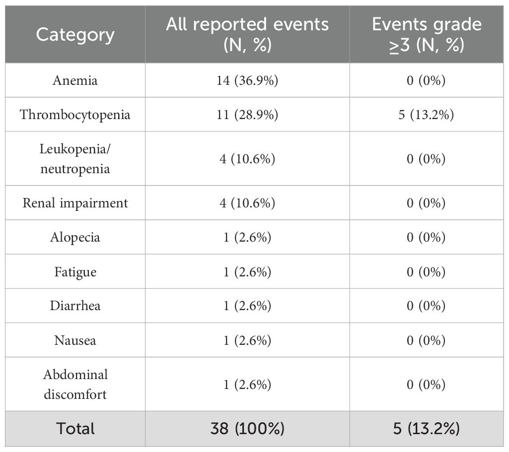 In total, 38 adverse events (AEs) were reported during the active treatment phase (Table 5). The majority were of mild or moderate intensity (CTCAE grade 1–2). Overall, 5 events (13.2%) were grade ≥3, with no persistent high-grade hematological toxicities observed. Hematological abnormalities were the most frequently reported events, including anemia (n=14, 36.9%), thrombocytopenia (n=11, 28.9%), and leukopenia/neutropenia (n=4, 10.6%). No cases of myelodysplastic syndrome were observed in any of the patients participating in the study. In addition, renal impairment (n=4, 10.6%), primarily increases in serum creatinine and decreases in eGFR, was documented, all grade 1–2. No cases of permanent renal failure were observed among the study participants, and none of the patients required renal replacement therapy. Single cases of alopecia, fatigue, and gastrointestinal complaints such as nausea, diarrhea or abdominal discomfort were observed, but each occurred only sporadically. All 5 event of grade ≥3 required discontinuations of the PRRT. Overall, the safety profile during the active treatment period was consistent with expectations, with adverse events being largely predictable, manageable, and reversible with supportive care.