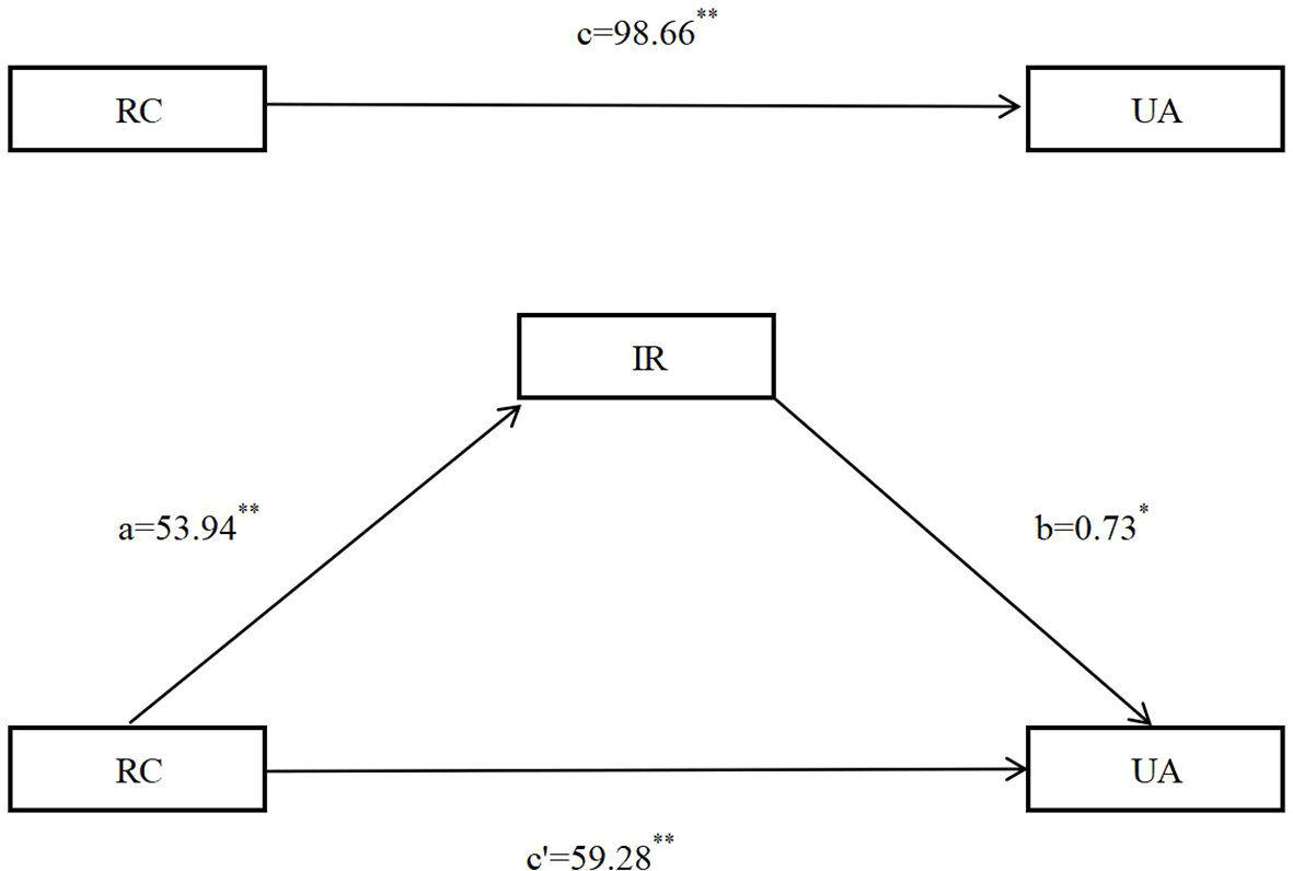 Figure 5. Mediation analysis between RC and UA mediated by IR after adjusting for confounding factors, including age, sex, education level, marriage status,occupation, total family income, smoking status, drinking status, physical activity level, night sleep duration, DASH score, hypertension, diabetes, overweight and obesity, central obesity. DASH. dietary approaches to stop hypertension; RC. remnant cholesterol. IR. insulin resistance; UA. uric acid. **P<0.001; *P<0.01.