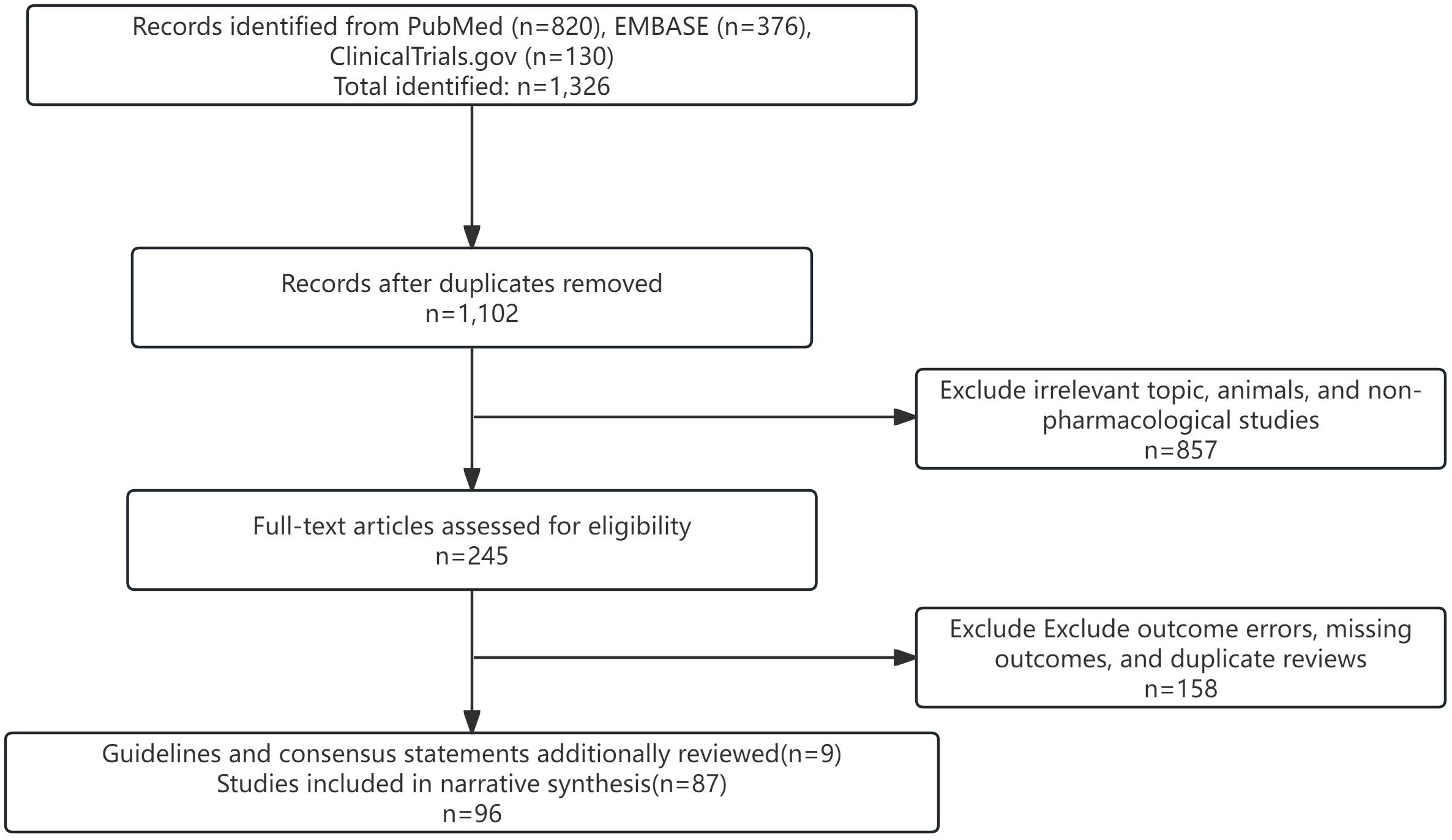 To capture high-quality evidence as comprehensively as possible, the authors conducted a structured search of PubMed, Web of Science Core Collection, and Embase for studies published between January 2020 and July 2025. The strategy centered on the core topic and combined Medical Subject Headings (MeSH) with free-text terms, for example:”(‘cardiometabolic multimorbidity’ OR ‘heart failure’ OR ‘coronary artery disease’) AND (‘type 2 diabetes’ OR ‘obesity’ OR ‘dyslipidemia’) AND (‘pathophysiology’ OR ‘mechanism’ OR ‘drug therapy’ OR ‘polypharmacy’ OR ‘deprescribing’).” (Figure 1). Complete search syntax are provided in Supplementary Material S1 for transparency.