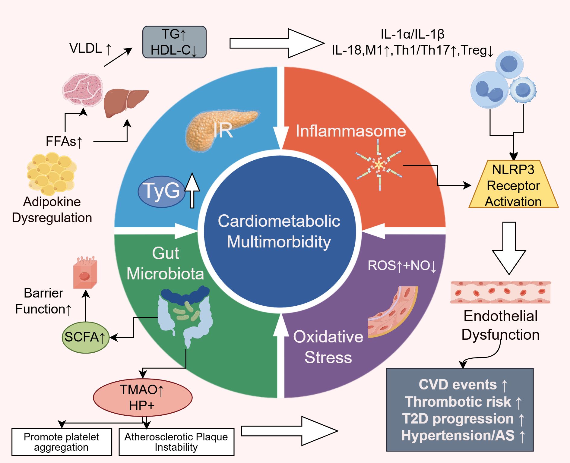 In recent years, growing clinical interest has focused on the role of gut microbiota dysbiosis in cardiometabolic diseases. Although causality remains to be fully established, its relevance to the pathogenesis of cardiometabolic multimorbidity is increasingly recognized. The gut microbiota is now regarded as a “quasi-endocrine organ” due to its systemic metabolic influence (41, 42).