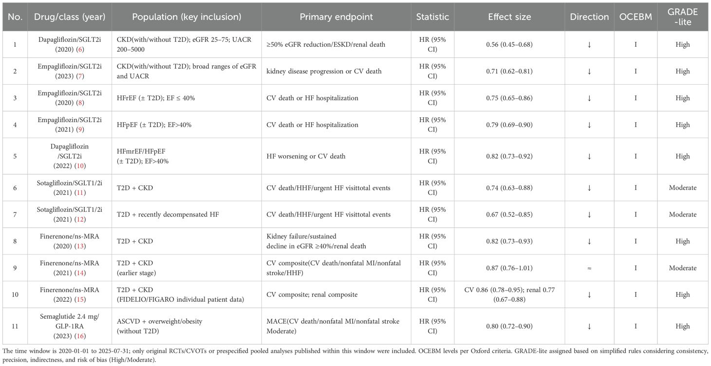 This paper is a narrative review. However, to ensure the quality of evidence in the included studies, three authors independently screened titles and abstracts and critically assessed methodological quality, sample size, consistency of results, and clinical relevance. Disagreements were resolved by the corresponding author. Although a formal PRISMA workflow was not undertaken, the Appendix details the full search strings, deduplication log, and selection notes. Priority was given to pivotal, large RCTs; influential experimental and translational work; high-impact systematic reviews and meta-analyses; and the most recent clinical practice guidelines and consensus statements from relevant professional societies. Evidence levels were assigned using the Oxford Centre for Evidence-Based Medicine (OCEBM) framework (Levels I–V). Certainty ratings were presented in parallel using a simplified GRADE approach (“GRADE-lite”: high/moderate/low), with up-/downgrading based on consistency, precision, indirectness, and risk of bias (Table 1).
