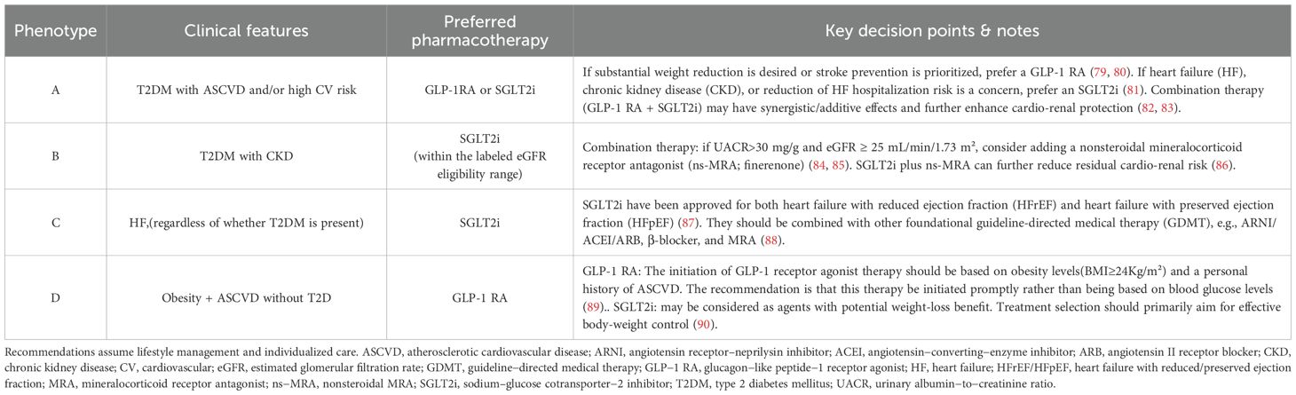 ● A phenotype-based decision table supports precision prescribing across ASCVD, HF, CKD and obesity.