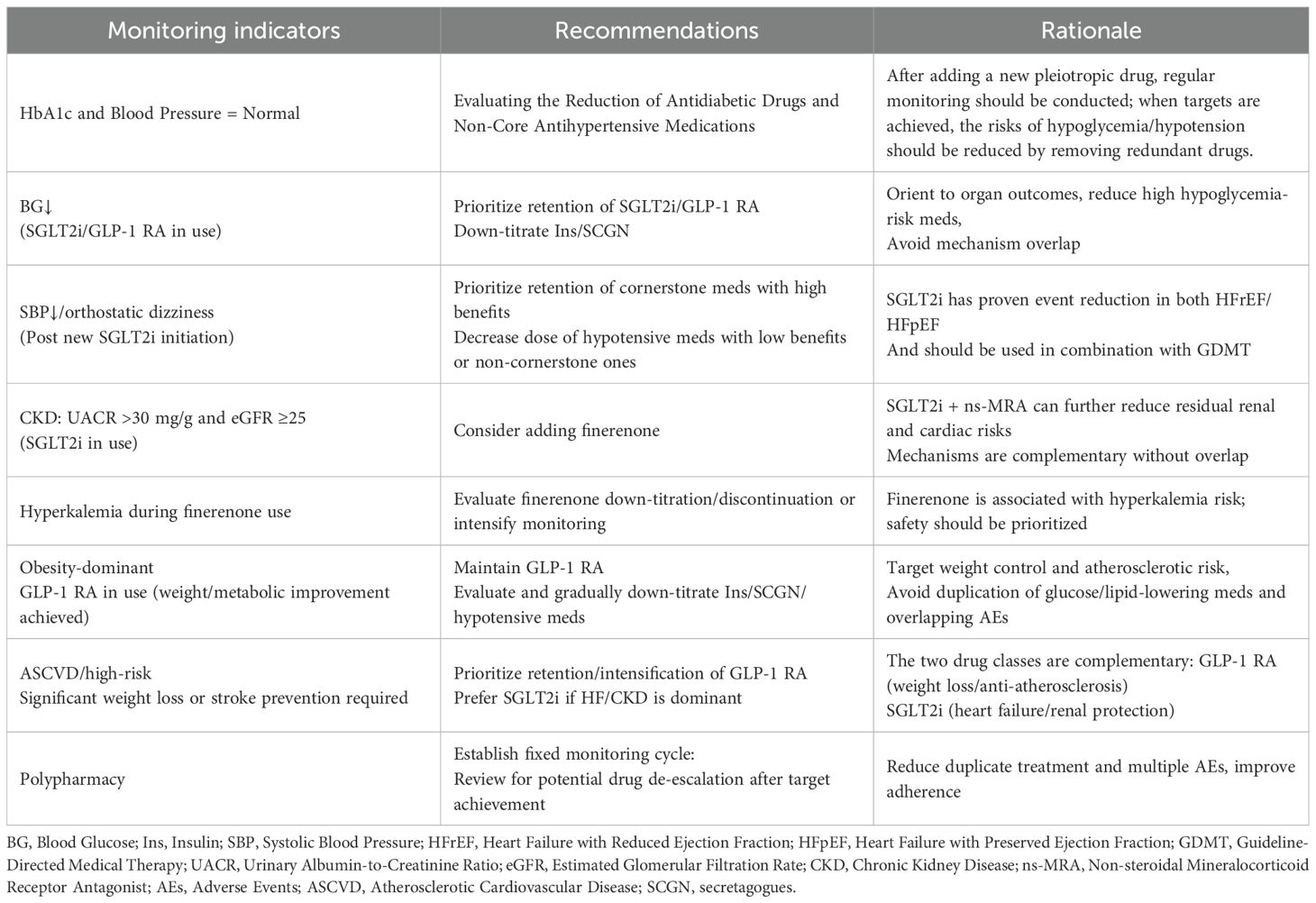 Following the initiation of newer therapies with established multi-organ benefits, such as SGLT2i and GLP-1RA, regular reassessment of the pre-existing treatment regimen is essential. When glycemic and blood pressure control is achieved, clinicians should consider de-escalation strategies, including dose reduction or discontinuation of other antihyperglycemic agents (e.g., insulin) and antihypertensives, to mitigate the risks of hypoglycemia and hypotension.