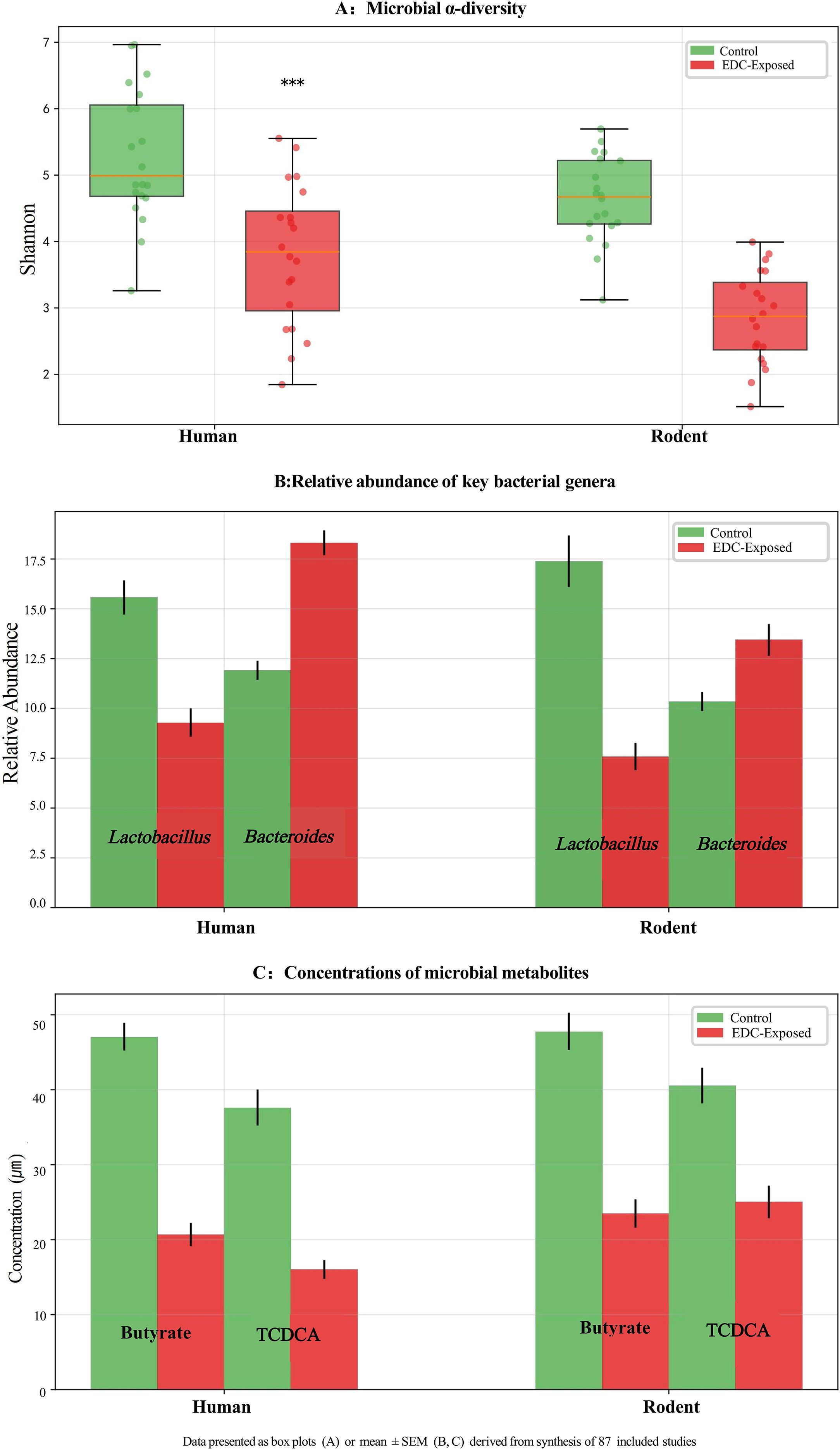 Figure 2. Conserved gut microbial dysbiosis induced by perinatal exposure to endocrine-disrupting chemicals (EDCs) across species. (A) Microbial α-diversity (Shannon Index) is significantly reduced in EDC-exposed groups compared to controls in both human and rodent studies. Data are presented as box plots. (B) Relative abundance of key bacterial genera Lactobacillus and Bacteroides. EDC exposure is associated with a marked decrease in Lactobacillus and an increase in Bacteroides in both species. (C) Concentrations of microbial metabolites butyrate (a short-chain fatty acid) and taurochenodeoxycholic acid (TCDCA, a secondary bile acid) are significantly suppressed following EDC exposure. Data in (B) and (C) are presented as mean ± SEM. All results are derived from a synthesis of 87 included studies. ***p < 0.001 vs. control group. Statistical analyses were performed using Mann-Whitney U test (A) or Student’s t-test (B, C) as appropriate.