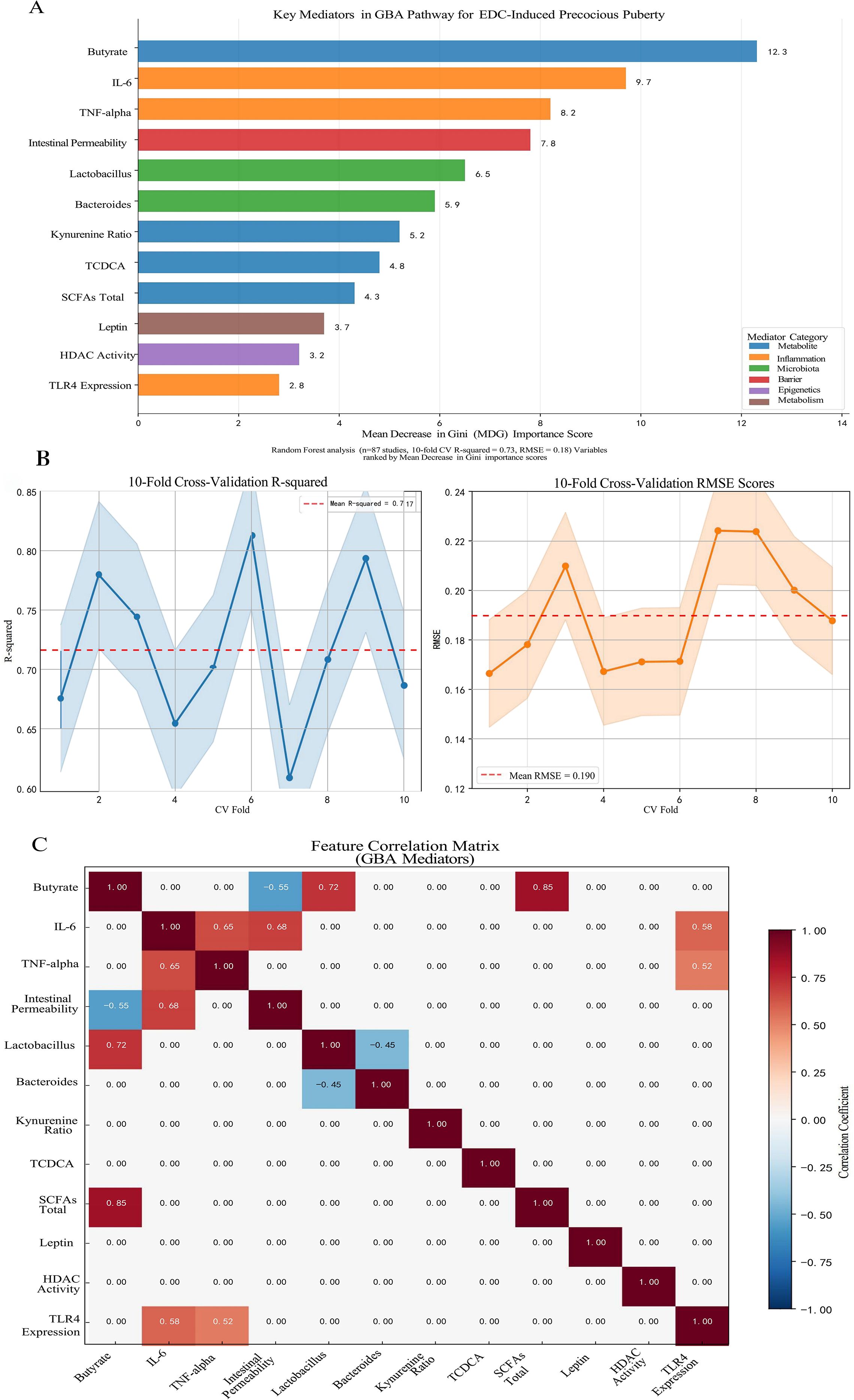 Figure 3. Identification of key mediators in the gut-brain axis (GBA) pathway for endocrine-disrupting chemical (EDC)-induced precocious puberty using Random Forest analysis. (A) Mean Decrease in Gini (MDG) importance scores for the top 12 mediators from a Random Forest model (500 decision trees). Butyrate depletion (MDG = 12.3) and IL-6 elevation (MDG = 9.7) emerged as the most prominent features associated with precocious puberty risk. Mediators are color-coded by functional category: microbial metabolites (blue), inflammatory markers (red), microbiota composition (green), intestinal barrier function (purple), epigenetic regulation (orange), and metabolic factors (brown). (B) Model performance metrics from 10-fold cross-validation, showing mean R² = 0.73 and root mean square error (RMSE) = 0.18, indicating robust predictive performance within the integrated dataset. (C) Correlation matrix among the top GBA mediators, highlighting significant interrelationships including the strong negative correlation between butyrate and intestinal permeability (r = -0.55), and the positive correlation between butyrate and total SCFAs (r = 0.85). The analysis was based on a semi-quantitatively integrated dataset from 87 studies examining EDC exposure effects on the gut-brain axis. Variable importance was quantified by MDG, with higher scores indicating greater contribution to the model’s prediction of precocious puberty risk.