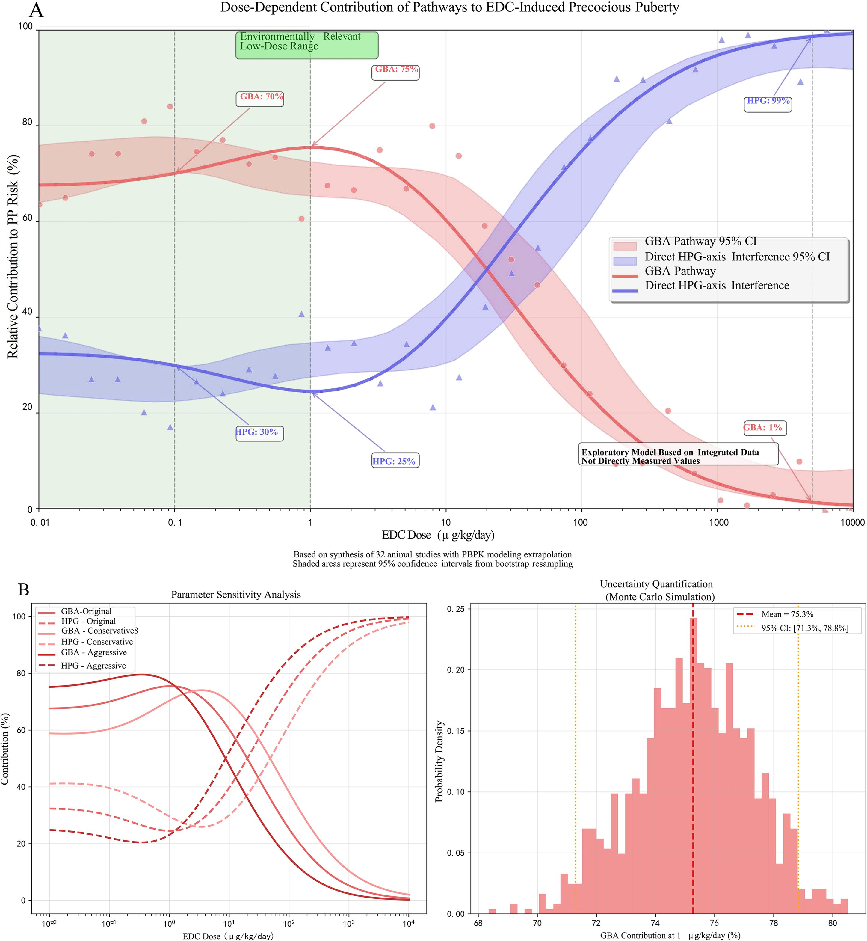 Figure 1. Proposed mechanistic framework and key quantitative insights for precocious puberty induced by low-dose endocrine-disrupting chemical (EDC) mixtures via the gut-brain axis. (A) Integrative pathway from EDC exposure to premature activation of the hypothalamic-pituitary-gonadal (HPG) axis, highlighting the central role of gut-brain axis disruption. Key steps include EDC-induced gut dysbiosis, impairment of microbial metabolite production (e.g., SCFAs, bile acids), increased intestinal permeability, systemic inflammation, and subsequent epigenetic and neural dysregulation of Kiss1/GnRH neurons. This pathway synergistically interacts with canonical mechanisms of direct HPG axis interference, oxidative stress, and epigenetic modifications. (B) Model-derived dose-dependent contributions of the gut-brain axis (GBA) pathway and direct HPG axis disruption to precocious puberty risk. The exploratory analysis suggests the GBA pathway may predominate at low, environmentally relevant doses (≤1 μg/kg/day), while direct endocrine disruption becomes dominant at higher doses. Data are synthesized from animal studies with dose extrapolation to a human context using physiologically based pharmacokinetic modeling. The specific quantitative estimates are hypothesis-generating and require further validation. The dose-response relationships and relative influences depicted here are derived from an exploratory, hypothesis-generating analysis of integrated heterogeneous data. They require validation in studies designed with environmentally relevant, low-dose mixtures.