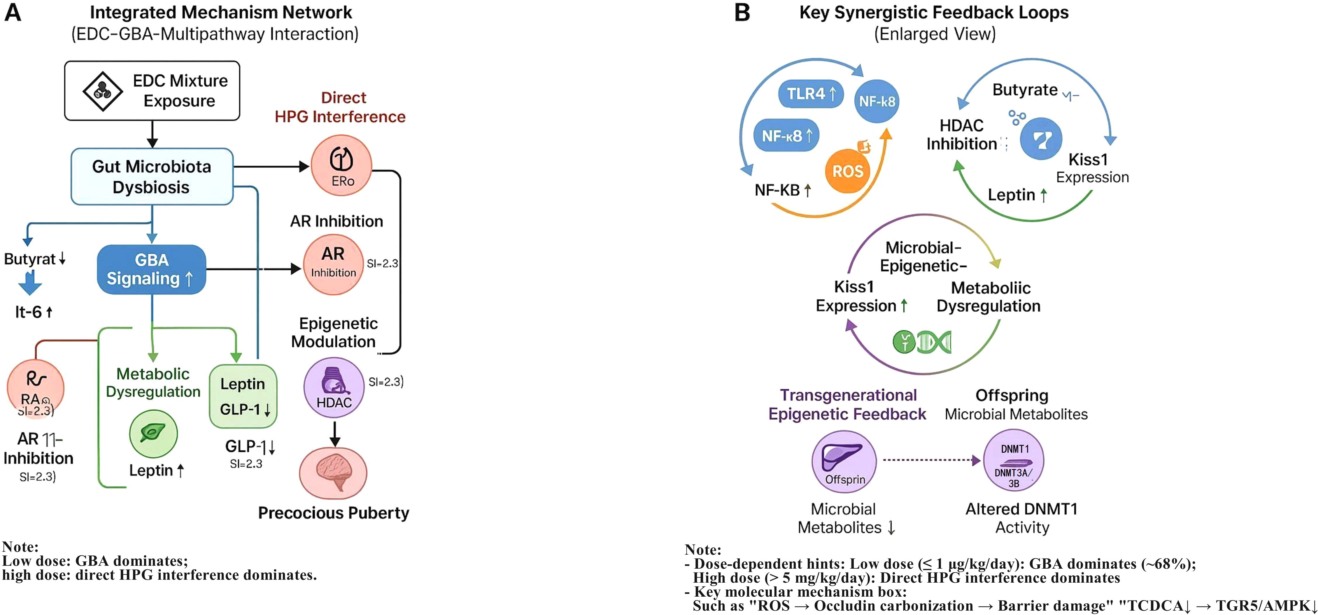 Conclusion: This review identifies the GBA as a critical and previously underappreciated mechanism for low-dose EDC mixture-induced precocious puberty in a dose-dependent manner. Our findings underscore the need for regulatory paradigms and future research to integrate this pathway when assessing the risks of complex, real-world chemical mixtures.