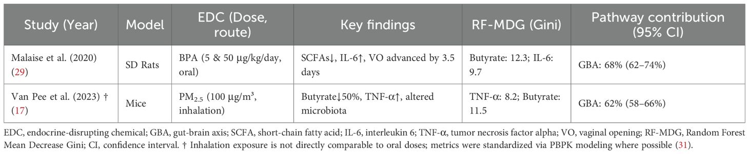 The exploratory Random Forest analysis, employed to identify key mediators within the GBA pathway, identified butyrate depletion (Mean Decrease Gini MDGini, MDGini = 12.3) and IL-6 elevation (MDGini = 9.7) as the most prominent features associated with PP risk in the model (Figure 3A). The model demonstrated robust predictive performance, with 10-fold cross-validation yielding R² = 0.73 and root mean square error (RMSE) = 0.18 (Figure 3B), indicating good internal consistency within the integrated dataset. To explore potential key drivers, we applied an exploratory Random Forest model. This analysis, constrained by our integrated dataset, identified that mediators within the GBA pathway collectively exhibited the highest relative importance, accounting for approximately 68% of the model’s internal variance explanation for PP risk at the examined low-dose range (≤1 μg/kg/day) (17). This suggests the GBA pathway may be a predominant feature in the model’s prediction under these conditions. It is crucial to note, however, that this estimate is derived from studies that, despite being categorized as “low-dose” in our analysis, often utilized doses higher than typical human environmental exposures (e.g., BPA at 5-50 μg/kg/day in rodents vs. human urinary levels around 3.2 μg/L). This model-derived estimate suggests the GBA pathway may be highly influential at low doses, but it does not establish a definitive causal proportion, and its primacy at truly human-relevant environmental doses requires direct experimental confirmation. Conversely, the model pattern was consistent with a shift towards direct HPG axis interference as the dominant mechanism in high-dose scenarios (>5 mg/kg/day) within the studied experiments (17). Furthermore, the correlation matrix among the top GBA mediators (Figure 3C) revealed significant interrelationships within the integrated dataset. Notably, a strong negative correlation was observed between butyrate levels and intestinal permeability (r=−0.55), while butyrate exhibited a strong positive correlation with total SCFAs (r=0.85). These associations underscore the interconnected nature of microbial metabolic output, gut barrier integrity, and systemic inflammatory tone within the GBA pathway, supporting the hypothesis that coordinated multi-factor disruptions contribute to EDC-induced precocious puberty. The exploratory Random Forest analysis suggested a dose-dependent shift in mechanistic dominance. At low doses (≤1 μg/kg/day), GBA-related mediators collectively accounted for approximately 68% of the model’s internal variance explanation for PP risk, whereas direct HPG axis interference became dominant at higher doses (>5 mg/kg/day). These dose-dependent contributions are illustrated in Figure 4. Key experimental findings supporting this analysis are summarized in Table 2.