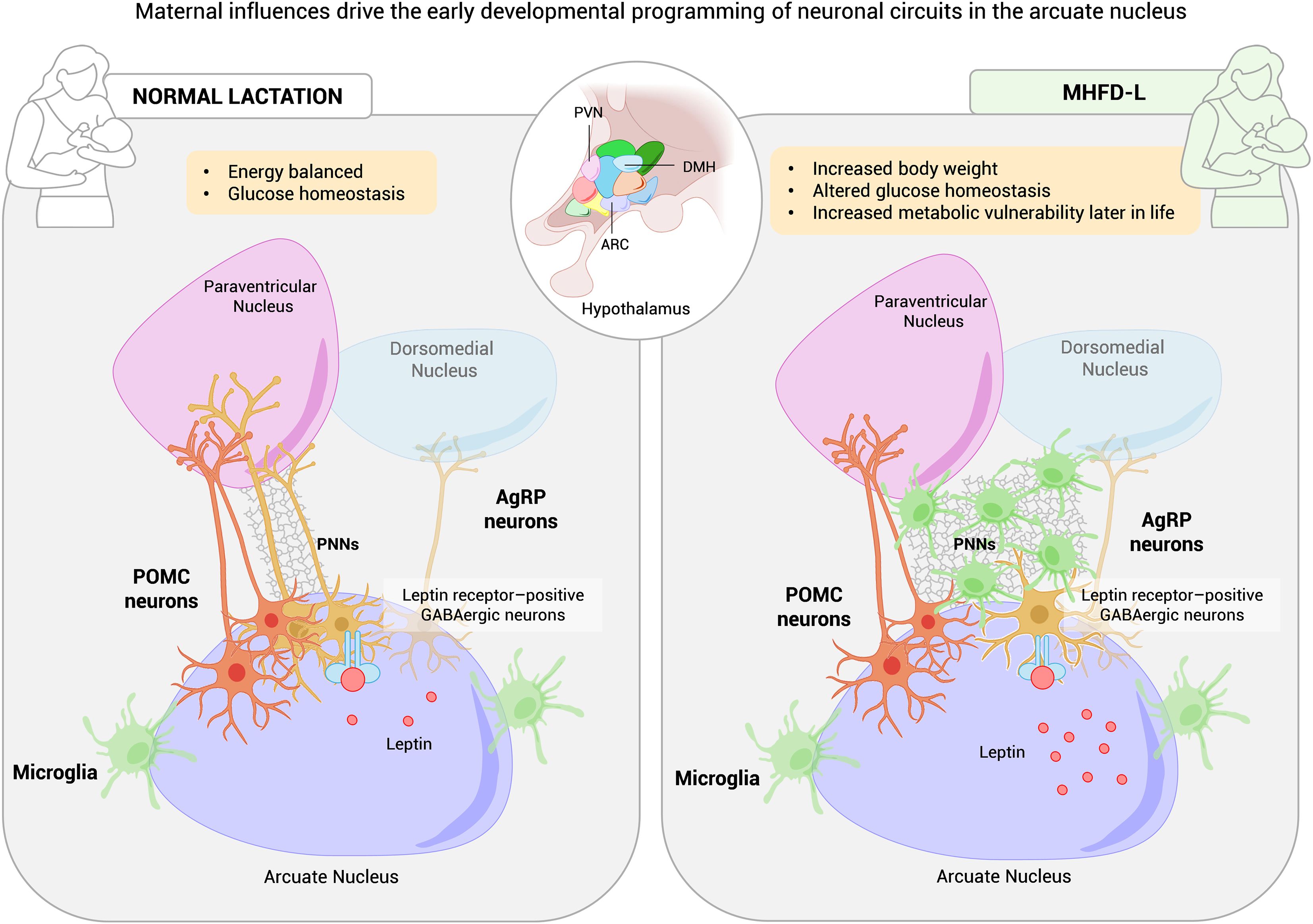 Beyond their role in adulthood, AgRP and POMC neurons undergo a critical developmental window that shapes lifelong metabolic regulation, including the regulation of glucose homeostasis. This period is regulated by perineuronal nets (PNNs), specialized extracellular matrix structures that envelop leptin receptor-positive GABAergic neurons within the ARC, limiting plasticity but ensuring the stability of this inhibitory neuronal circuit throughout adulthood in humans and rodents (29). Although the timing of hypothalamic maturation differs between species, postnatal in rodents versus prenatal in humans, the concept of a developmentally restricted period of metabolic sensitivity appears conserved.
