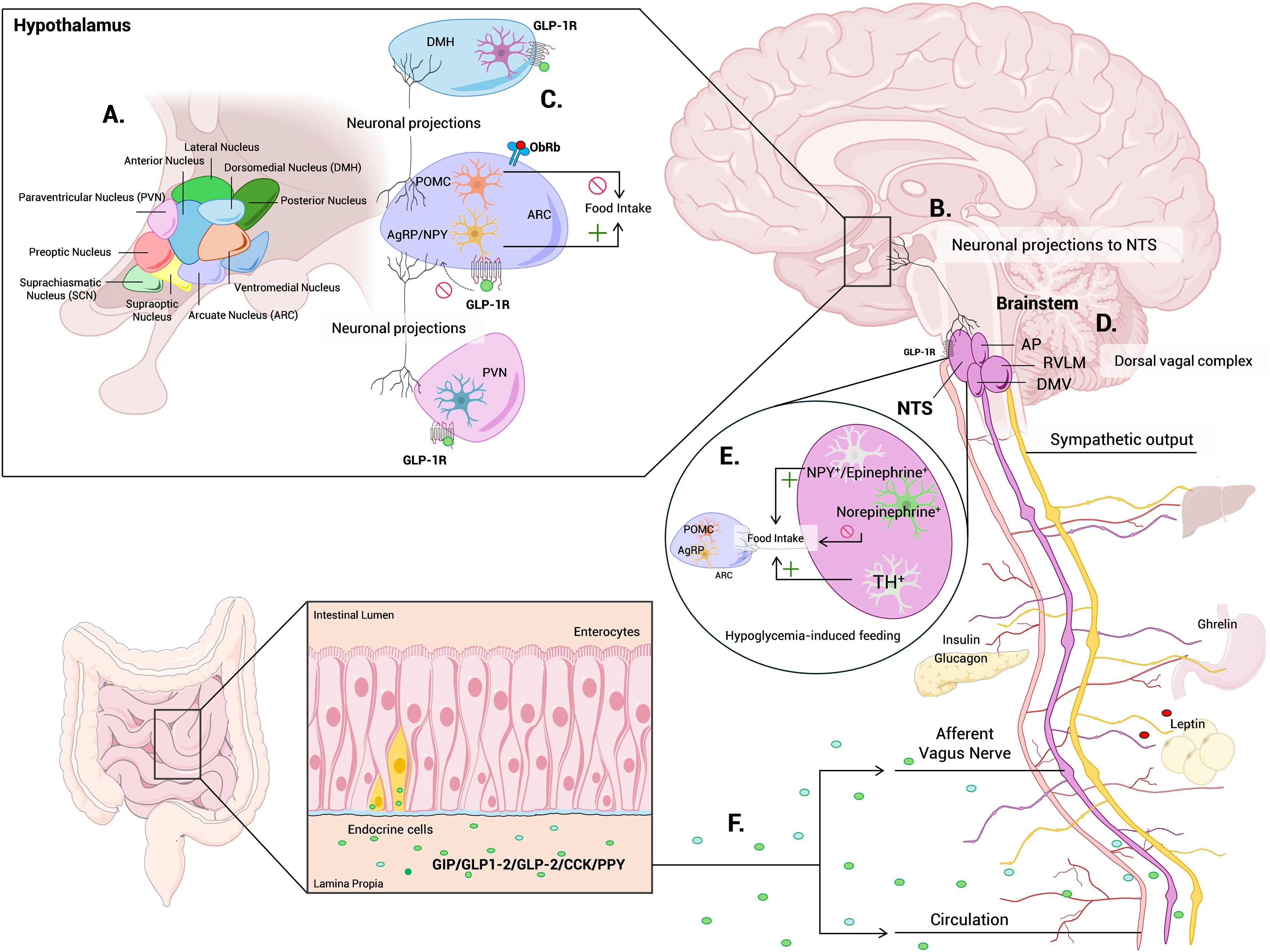 Altogether, the emerging picture places GLP-1 not only as a gut-derived hormone but as a central neuropeptide coordinating satiety, autonomic regulation, and glucose homeostasis. Understanding how endogenous and pharmacological incretin pathways interact, across neural circuits, metabolic organs, and sex-specific contexts, will be crucial to developing the next generation of personalized anti-obesity and antidiabetic therapies.