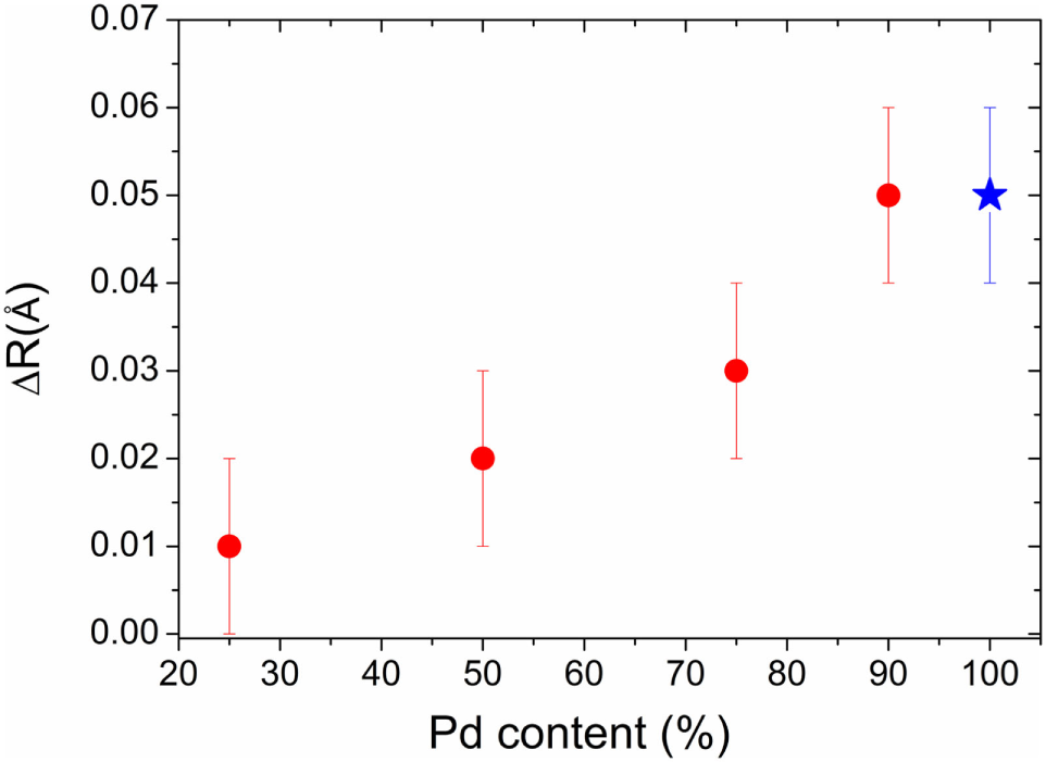 The increase of first neighbors distance ΔR (red symbols) upon hydrogen absorption at 1 bar H2 pressure and 20°C in ultrasmall Pd–Rh nanoalloys versus Pd content. The value for the Pd90Rh10 composition was calculated based on in situ XRD, whereas the ones for Pd75Rh25, Pd50Rh50, and Pd25Rh75 were determined by in situ EXAFS at Pd K edge. For the sake of comparison, our previous result on carbon-supported 2.5-nm Pd nanoparticles is also plotted (blue symbol), as obtained by in situ EXAFS (Zlotea et al., 2010b).