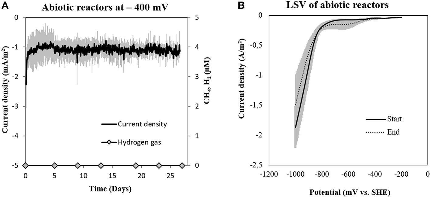 (A) Current consumption and gas production in four abiotic reactors at −400 mV (vs. SHE) and (B) Linear Sweep Voltammetry (LSV) of abiotic reactors at the start and end of the experiment (n = 3).