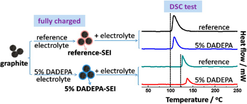 DSC curves of fully charged graphite in reference electrolytes with and without DADEPA. Reprinted with permission from Cao et al. (2013). Copyright (2013) American Chemical Society.