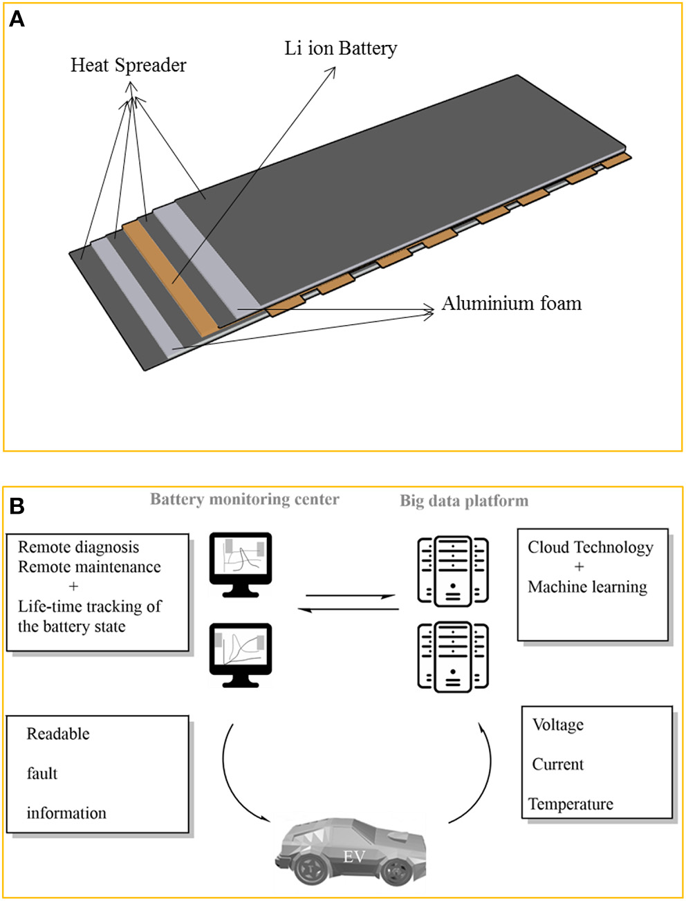 (A) Schematic design of lithium ion battery pack with aluminum foam between heat spreader and the battery. Adapted from Saw et al. (2017). (B) Remote battery monitoring centers linking BMS to big data facilities. Adapted from Xiong et al. (2018).