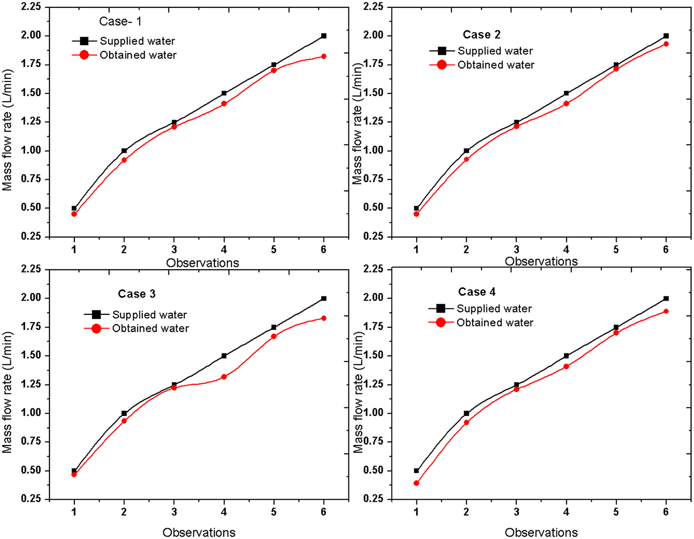 Here, the mass flow rate is taken as 0.5, 1, 1.25, 1.5, 1.75, and 2 L/min.