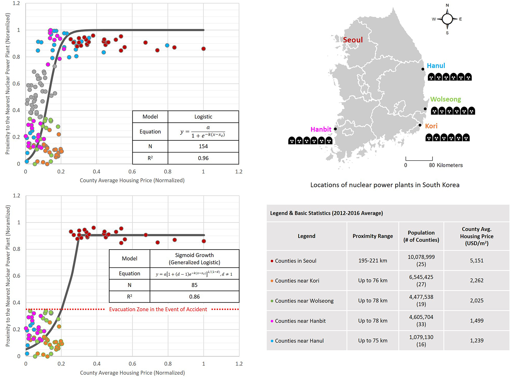 Relying on the findings of the U.S. NRC, IAEA, and NASEM on the relationship between risk of harm and plant proximity to guide our case study, we then turned our focus to the second relationship, namely, socioeconomic vulnerability and plant proximity. Socioeconomic vulnerability is measured by county average housing price.11 Data for income per capita or per household are not available at the county level in South Korea.