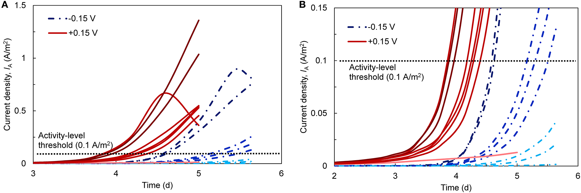 (A) Current densities (IA; normalized to anode surface area) over time during the startup phase of the bioanodes. Eight replicates (red lines) were started with an applied anode potential [EAN; reported vs. the standard hydrogen electrode (SHE)] of +0.15 V and another eight (blue, segmented lines) were started at −0.15 V. The dark, medium, and light shading of the lines corresponds to high-, low-activity, and inactive bioanodes, respectively. The horizontal dotted line denotes the current density threshold (0.1 A/m2) selected to define the bioanode activity level. (B) A closer view of the bioanode startup current densities with respect to the activity threshold.