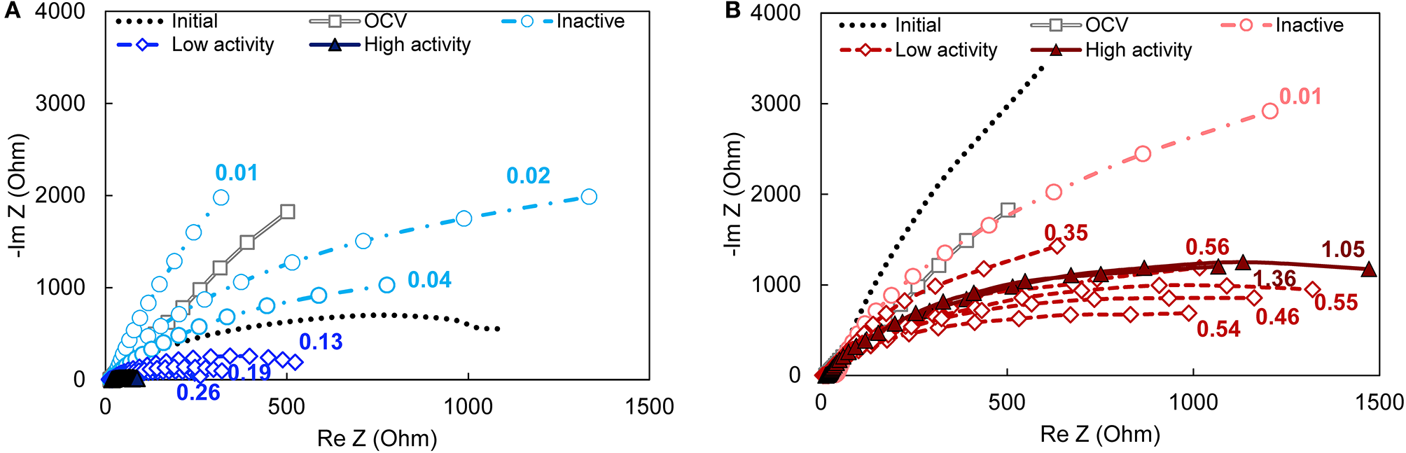 Nyquist plots of bioanodes fixed at (A)EAN = −0.15 V and (B)EAN = +0.15 V taken at the end of the startup cycle. All curves in the same plot are replicates. The magnitude of impedance is lower when the ratio of the curve is lower, which translates into lower total resistance. High-, low-activity, and inactive bioanode levels are defined based on the time required to reach the startup current threshold (Figure 1). The numbers next to each curve are the current density recorded at the end of the startup period. OCV, open circuit voltage (gray double line with squares); Initial—prior to inoculation (dotted line).