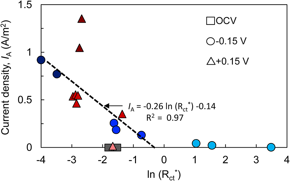 Relationship between bioanode charge transfer resistance (; normalized to each bioanode's resistance prior to introducing microorganisms) and current density (IA). Both metrics were recorded at the end of the startup cycle. Points with the same shape represent replicate bioanodes fixed at −0.15 V (circles) and +0.15 V (triangles). The points are shaded to reflect bioanode activity level (dark, high-activity; medium, low-activity; light, inactive). OCV, open circuit voltage bioanodes (squares). The linear regression of high- and low-activity bioanode points at −0.15 V is shown as a dashed line.