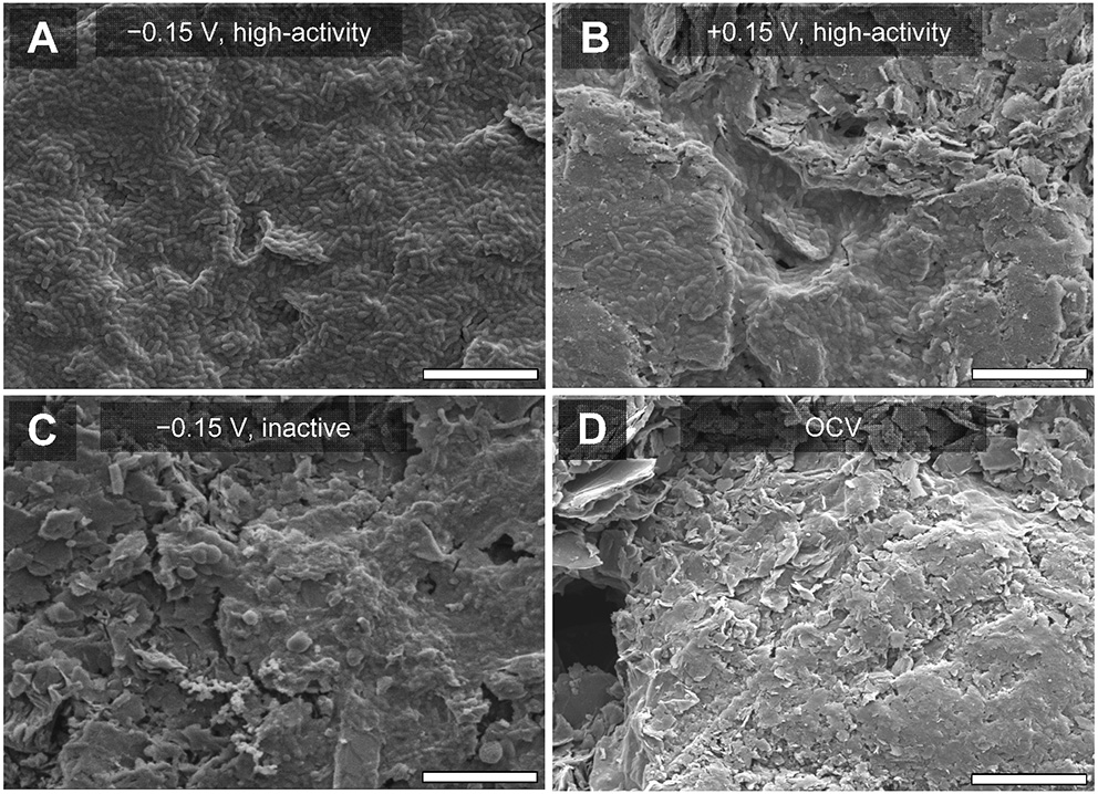 We visualized the bioanode surfaces to qualitatively assess relationships between the electrochemical characteristics described above and biofilm coverage. To do this, we captured SEM images of the bioanodes at the end of the startup cycle. At −0.15 V, the high-activity bioanodes were fully covered with a homogenous layer of microorganisms (Figure 5A), and the low-activity bioanodes had little to no coverage (data not shown). At +0.15 V, biofilm coverage was patchy and heterogeneous (Figure 5B), with no clear difference between high- and low-activity bioanodes. Inactive bioanodes at both potentials showed a less defined colonization pattern (Figure 5C), which was similar to the OCV controls (Figure 5D).