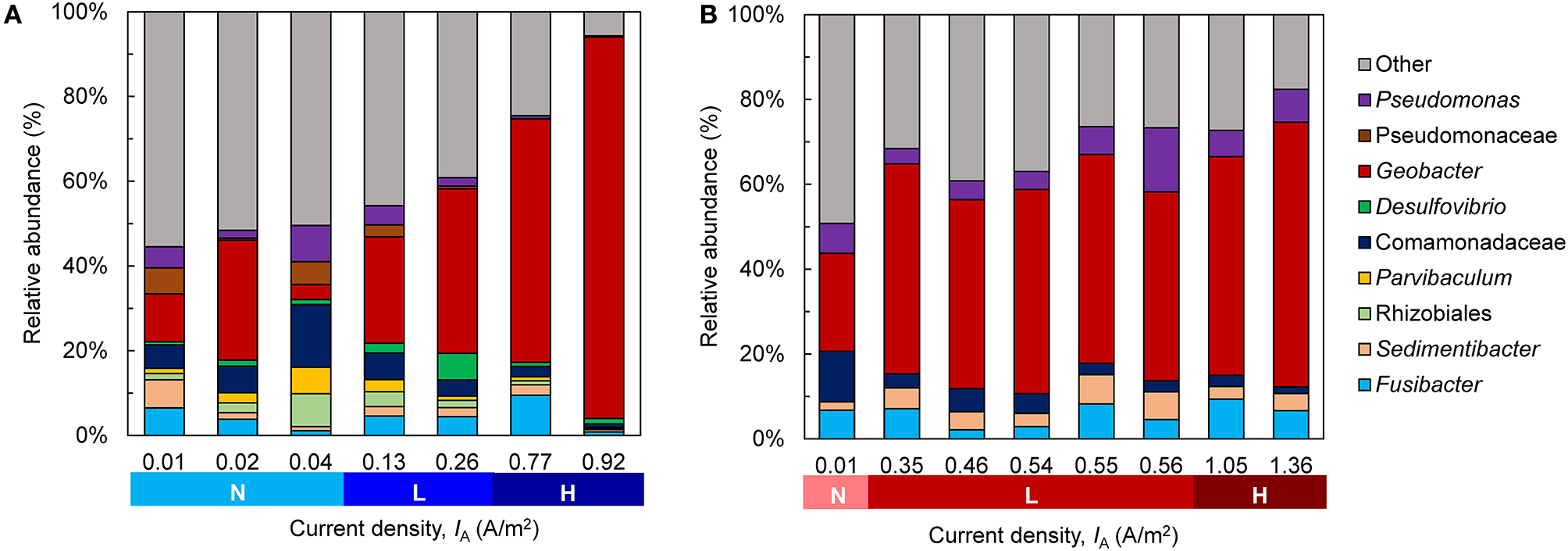 Community composition of the bioanode biofilms fixed at (A) −0.15 V and (B) +0.15 V. The replicates for each anode potential are ordered from lowest to highest current density (IA) recorded at the end of the startup cycle and are categorized according to their activity level during the startup cycle [Inactive (N), low-activity (L), high-activity (H)]. Genera with a relative abundance <5% are grouped into “Other”.