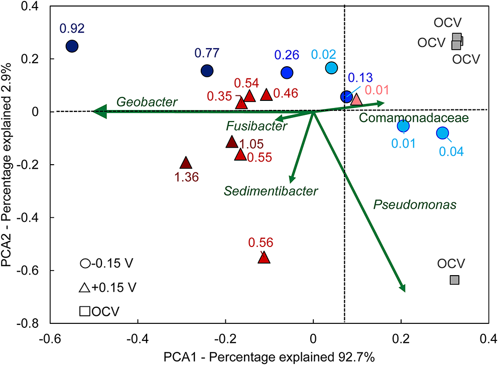 Principal component analysis (PCA) biplot of anode biofilm microbial communities. Points with the same shape represent replicate bioanodes fixed at −0.15 V (circles) and +0.15 V (triangles). The points are shaded to reflect bioanode activity level (dark, high-activity; medium, low-activity; light, inactive). The numbers next to each curve are the current density recorded at the end of the startup period. Green vectors symbolize the eigenvector of the corresponding genus. Samples that are located in the direction of an eigenvector contain that particular genus, with an increased relative abundance the farther they are located from the center. OCV, open circuit voltage bioanodes (squares).