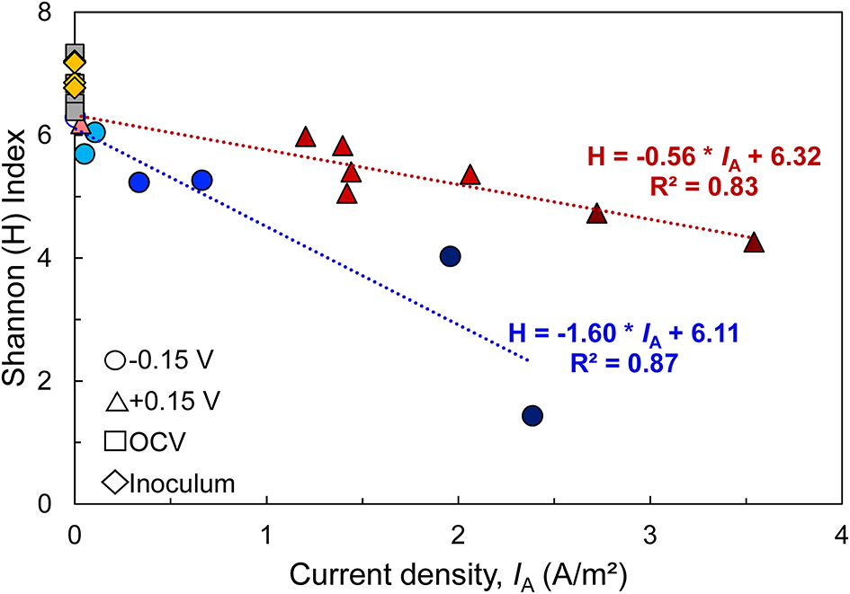 Relationship between microbial diversity [estimated by the Shannon Diversity index (H)] and bioanode current density (IA) recorded at the end of the startup cycle. A higher H index represents a more diverse microbial community. Linear regression of replicates from each fixed potential are represented by dotted lines (blue: −0.15 V, red: +0.15 V), along with regression equation and coefficient of determination (R2). Points with the same shape represent replicate bioanodes fixed at −0.15 V (circles) and +0.15 V (triangles). The points are shaded to reflect bioanode activity level (dark, high-activity; medium, low activity; light, inactive). Communities from the wastewater inoculum are shown as yellow rhombi and the open circuit (OCV) controls are represented as gray squares.