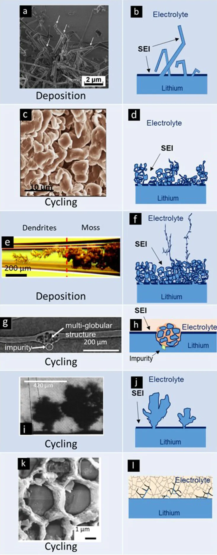 Name, experimental visualization, and schematic of common morphologies of electrodeposited lithium. Images of whiskers, mosses, dendrites, globules, trees, and cracks are reproduced with permission from (a) Steiger et al. (2014), (b) Qian et al. (2015), (c) Bai et al. (2016), (d) Harry et al. (2015), (e) Brissot et al. (1998), and (f) Cheng et al. (2017).