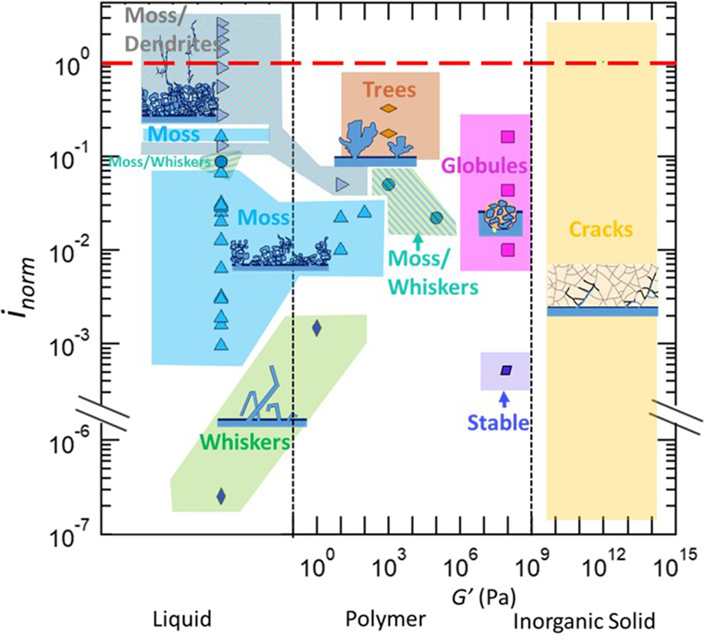 Polymers. Low modulus polymers (G' <10 Pa) exhibit behavior similar to liquids at low values of inorm. At inorm = 0.001, whiskers are seen in a cell that does not contain a separator. Note that at this value of inorm, mossy lithium deposits have been observed in liquid cells with separator (see Figure 1). This suggests that some of the mossy deposits seen in liquid electrolytes may be due to the pressure exerted by the separator. Increasing inorm to 0.01 results in the formation of moss, which is seen in the range between 0.01 and 0.04. At higher normalized current densities, coexisting moss/dendrites are seen. With higher modulus polymers (G' = 103 Pa) and higher normalized current densities, coexisting moss/whiskers are seen for 0.02 < inorm < 0.05. At higher normalized current densities, inorm ≥ 0.2 trees are observed (orange). Increasing the modulus of polymers to 108 Pa results in stable lithium deposition at inorm = 0.005. While the current used under these conditions are too low for practical applications, it is important to note that whiskers are obtained at the same normalized current density in both liquids and polymers with G' < 10 Pa. Increasing inorm to 0.01 results in the formation of globular protrusions. This morphology is seen up to inorm = 0.2.