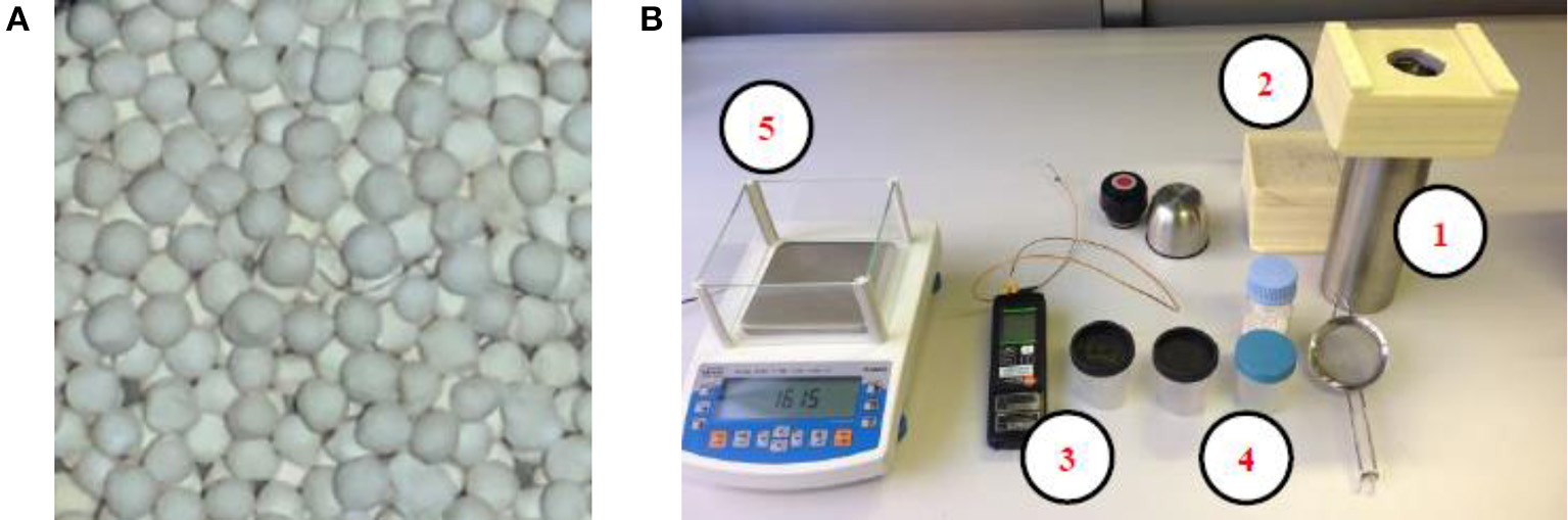 (A) Sample of the commercial 13X zeolite used in the experimental characterization as sorbent material: Köstrolith® 13XBFK by Chemiewerk Bad Köstritz GmbH (CWK-BK datasheets, 2019). (B) Overview of the material and instruments used for the experimental characterization of the sorption working pairs: (1) Dewar flask, (2) insulated tap, (3) K-type thermocouple, (4) zeolite containers, (5) precision balance.