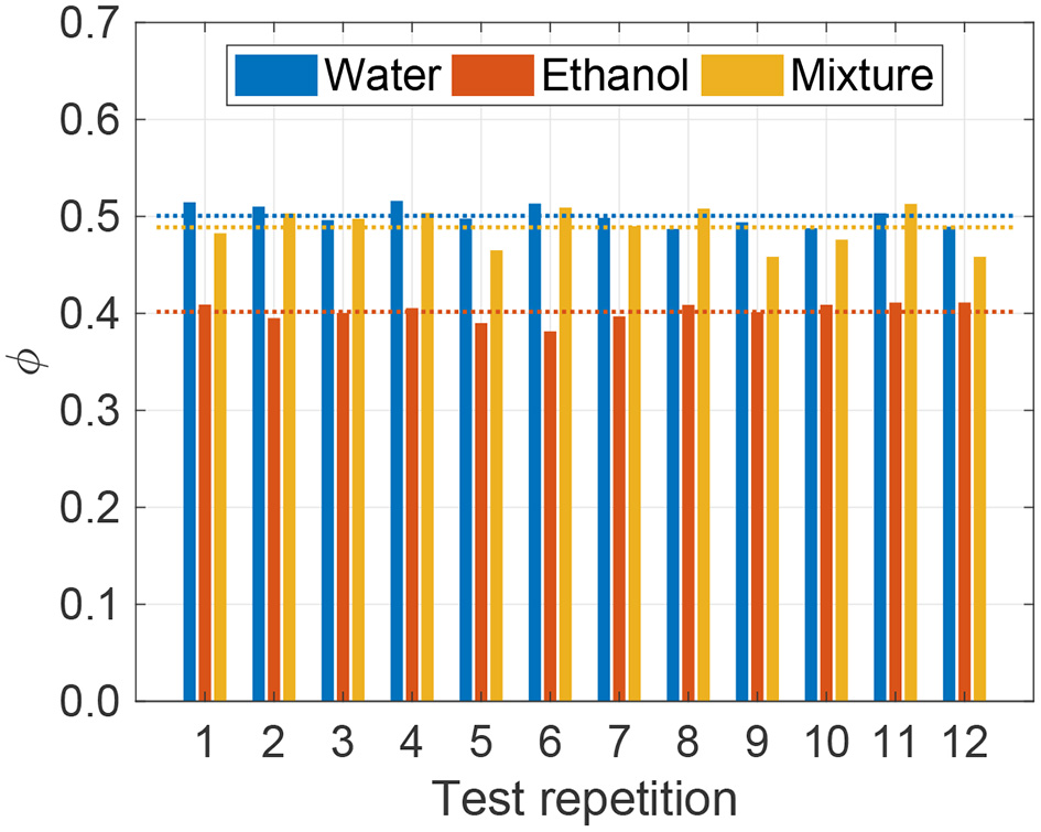 Loaded liquid fraction (ϕ in Equation 1) obtained for twelve repetitions of the experimental characterization test at ambient pressure (p = 1 bar) and temperature (T = 20°C) on pristine zeolite samples for the different tested fluids (water, ethanol and 30:70%wt. ethanol-water mixture). The dotted lines show the mean value over the repetitions for the three different fluids.