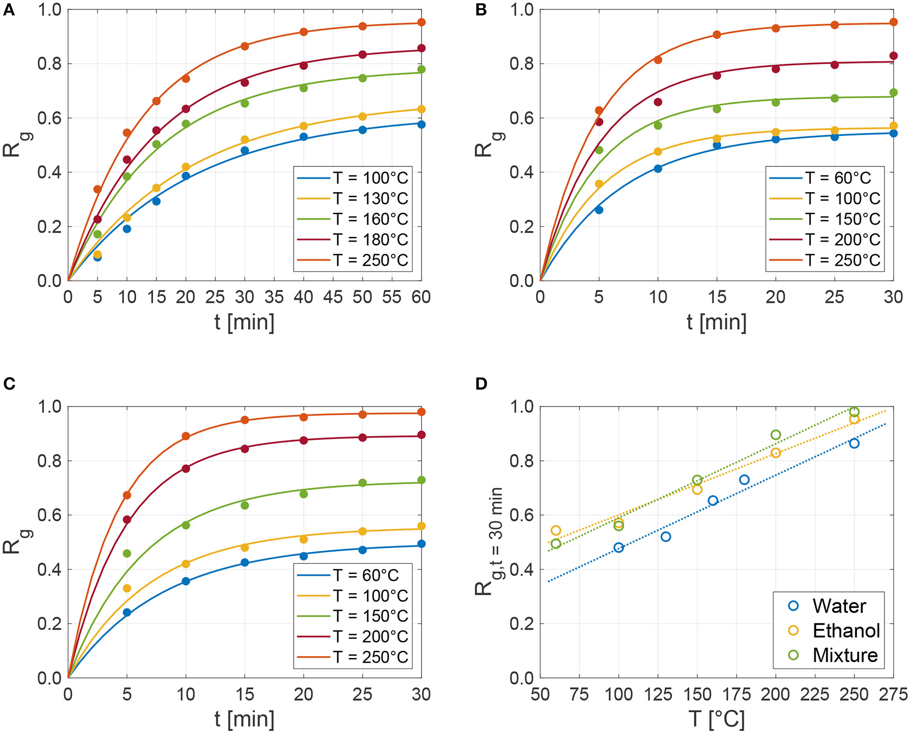 Regeneration grade (Rg in Equation 2) as a function of time obtained by the experimental characterization tests on the 13X zeolite samples at different controlled temperatures for (A) distilled water, (B) ethanol, and (C) 30:70%wt. ethanol-water mixture. The dots correspond to the experimental data points, while solid lines show the best-fit of Equation (5). (D) Shows the regeneration grade measured at 30 min for the three tested fluids as a function of temperature (dots) and their linear fitting (dotted lines).